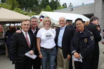 (From Left to Right) King County Councilmember Pete von Reichbauer, Manager of the Wild Waves Theme Park, Jeff Stock, Gina Miller, fiancé of fallen Washington State Patrol Trooper Tony V. Radulescu, U.S. Congressman Adam Smith, and Deputy Chief of the Federal Way Police Department, Andrew Hwang at the 23rd Annual Flag Day Celebration.)