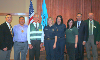 Photo (from left): King County Councilmember Pete von Reichbauer, Muckleshoot Indian Tribal Council Vice Chair Mike Jerry Sr., Wesley Homes Campus Administrator Scott Hulet, Valley Regional Fire Authority Firefighter Kelly McDonald, Valley Regional Fire Authority Firefighter Kelly Williams, Auburn Emergency Management's Heather Kitchen, King County Executive Dow Constantine, and Auburn City Councilmember Rich Wagner)