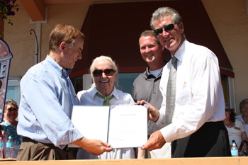 Photo (from left): King County Councilmember, Pete von Reichbauer, Original Owner of Enchanted Village with husband Byron Betts, May Betts, Wild Waves Theme Park General Manager, Todd Suchan, Wild Waves Theme Park CEO, Jeff Stock)
