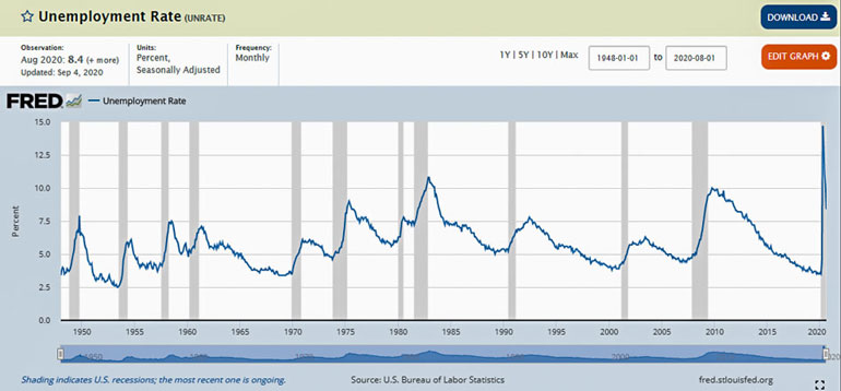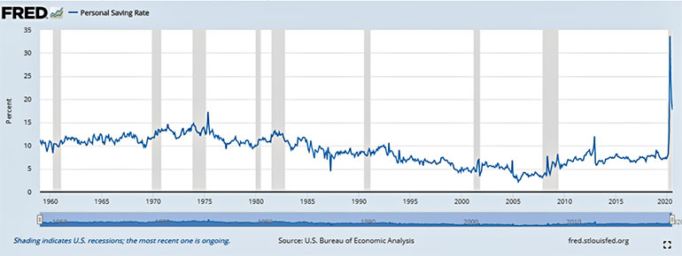 This chart shows the spike in savings rate from eight percent to thirty-three percent during the COVID-19 shutdowns. This could mean there is pent-up demand in the economy, which happens when there is reluctance or inability among consumers to make purchases. As the economy reopens, a surge in spending could send the savings rate back to pre-COVID levels.