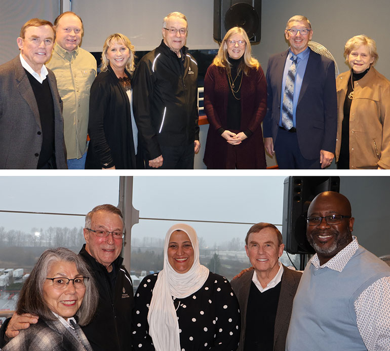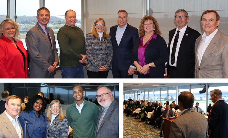 (Top) With Pacific Mayor Vic Kave, Kent Councilmember Toni Troutner, Kemper Freeman, Des Moines Mayor Traci Buxton, Algona Mayor Troy Linnell, and Federal Way Council President Linda Kochmar; (Bottom) With Auburn Councilmember Yolanda Trout-Manuel, Kemper Freeman, and Auburn Councilmembers Hanan Amer and Clinton Taylor
