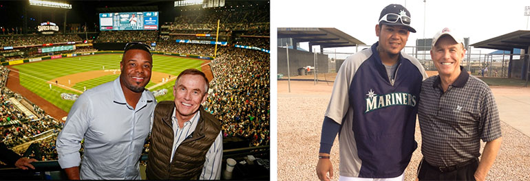 (Left) With Ken Griffey Jr. at an earlier Opening Day; (Right) With “The King” Félix Hernández at an earlier Spring Training