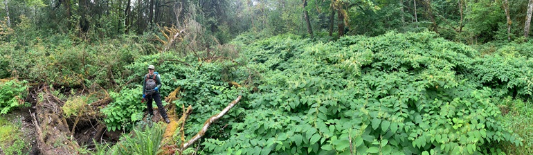 When you get the eye for it, knotweed is easy to spot in large stands on open riverbanks. It's harder to see just how far it can spread into a floodplain forest in a short time and keep other plants from growing. Established knotweed impacts water quality, habitat health, and can damage property. The King County Noxious Weed Control Program works to remove knotweed and restore native plant communities along county rivers and floodplains. Knotweed is famously difficult to control and success is only possible with the persistent community effort of county residents, private landowners, and public agencies.