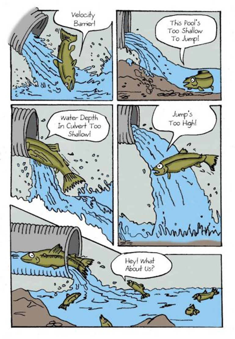 Culverts may block fish migration if the water flow is too swift, too shallow, or creates a waterfall at the entrance or exit.