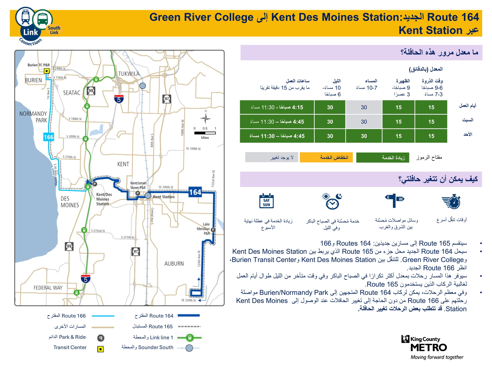 خط جديد متكرر خلال ساعات الذروة لزيادة عدد الرحلات كل يوم في الأسبوع. وسيستبدل هذا الخط جزءًا من خط 165. سيتم الربط بـالقطار الخفيف Link في محطة Kent Des Moines. ستُشغَّل جميع الرحلات عبر الخط 164 للركاب الذين يسافرون إلى أماكن أبعد من محطةKent Des Moines. شاهد كيف ستعمل المسارات 164 و166 |