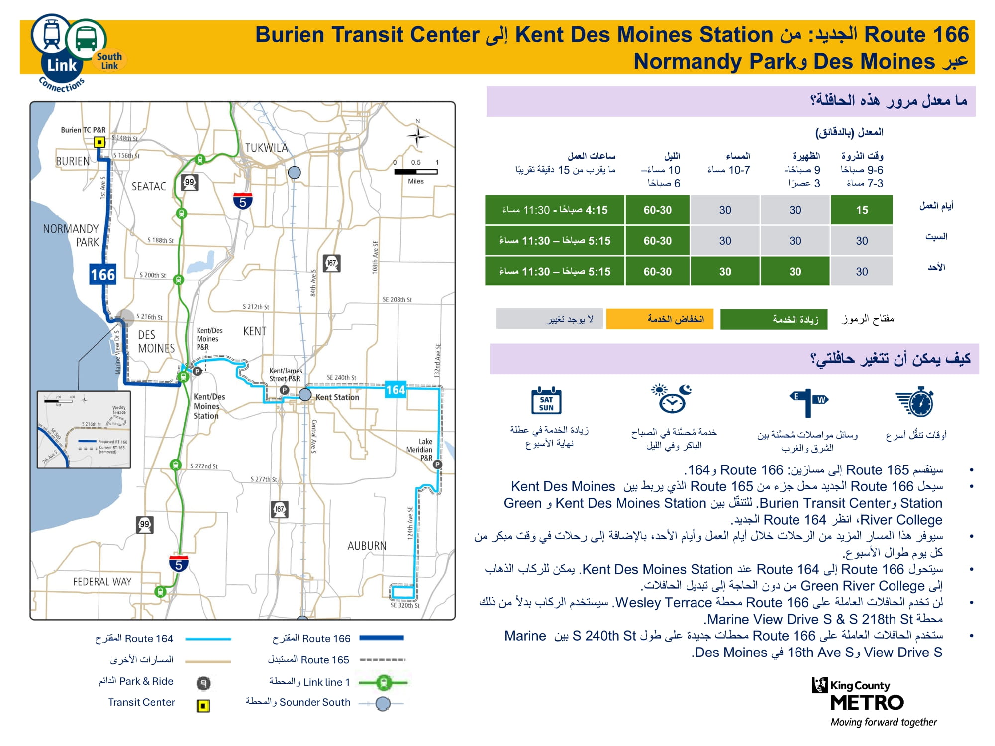 خط جديد متكرر لزيادة عدد الرحلات كل يوم في الأسبوع. وسيستبدل هذا الخط جزءًا من خط 165. سيتم الاتصال بالقطار الخفيف Link في محطة Kent Des Moines. ستُشغَّل بعض الرحلات عبر الخط 166 للركاب الذين يسافرون إلى أماكن أبعد من محطة Kent Des Moines. شاهد كيف ستعمل المسارات 164 و166 |