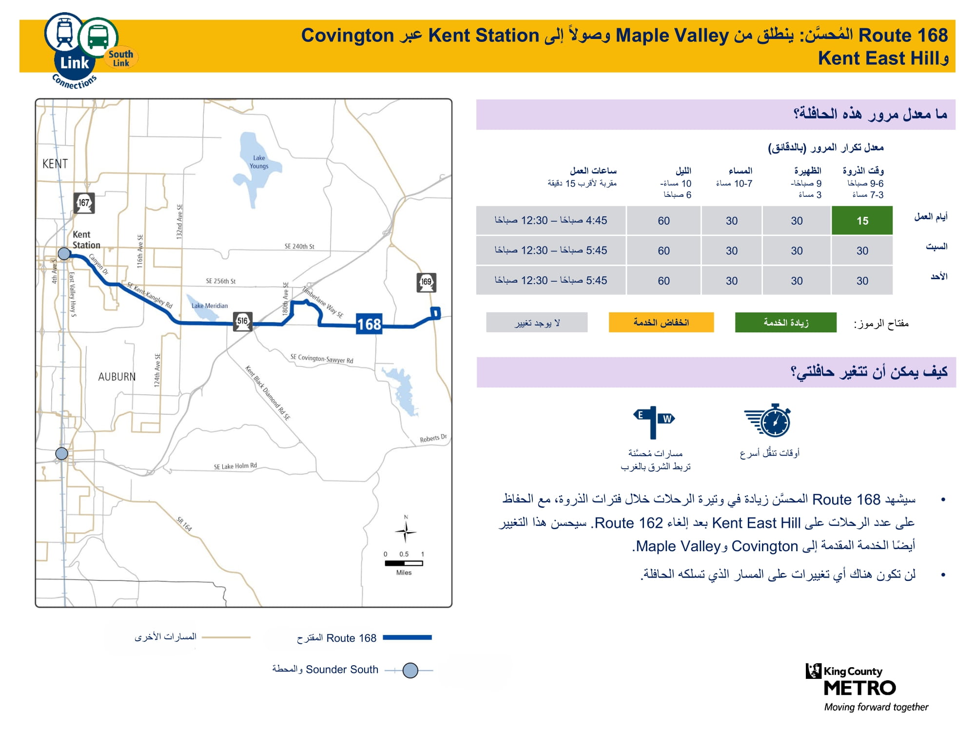 | 168 ويخدم Kent، و Covington، و Maple Valley |
