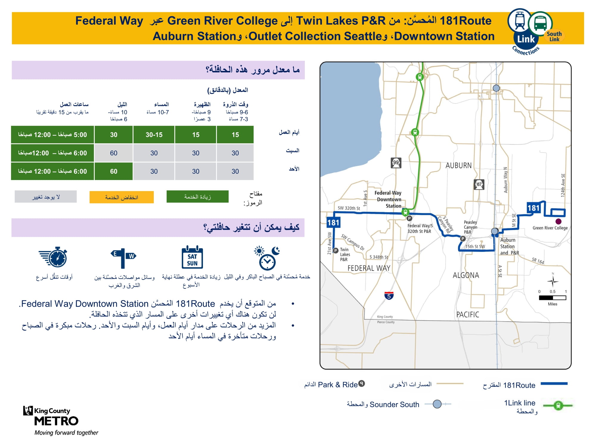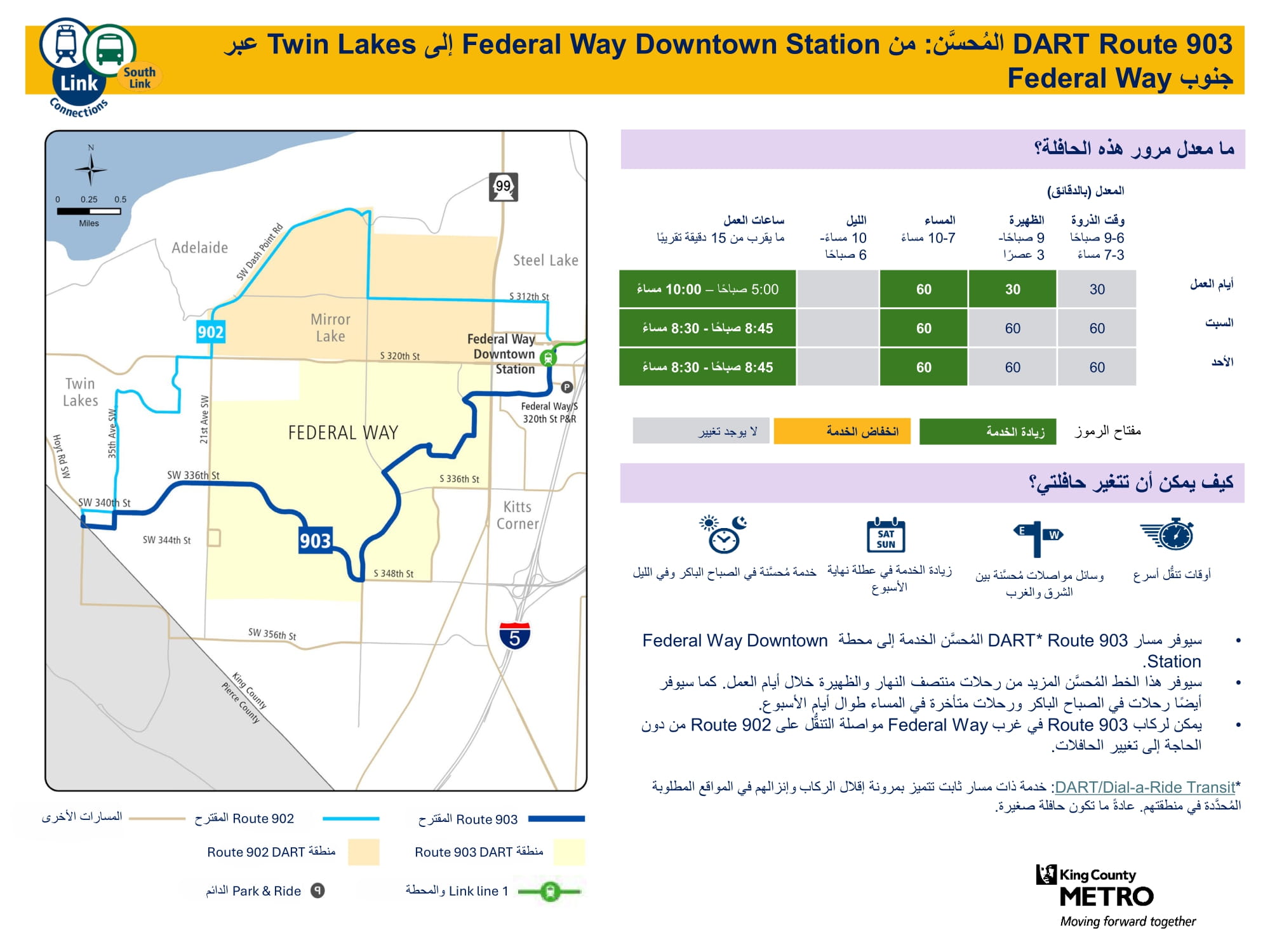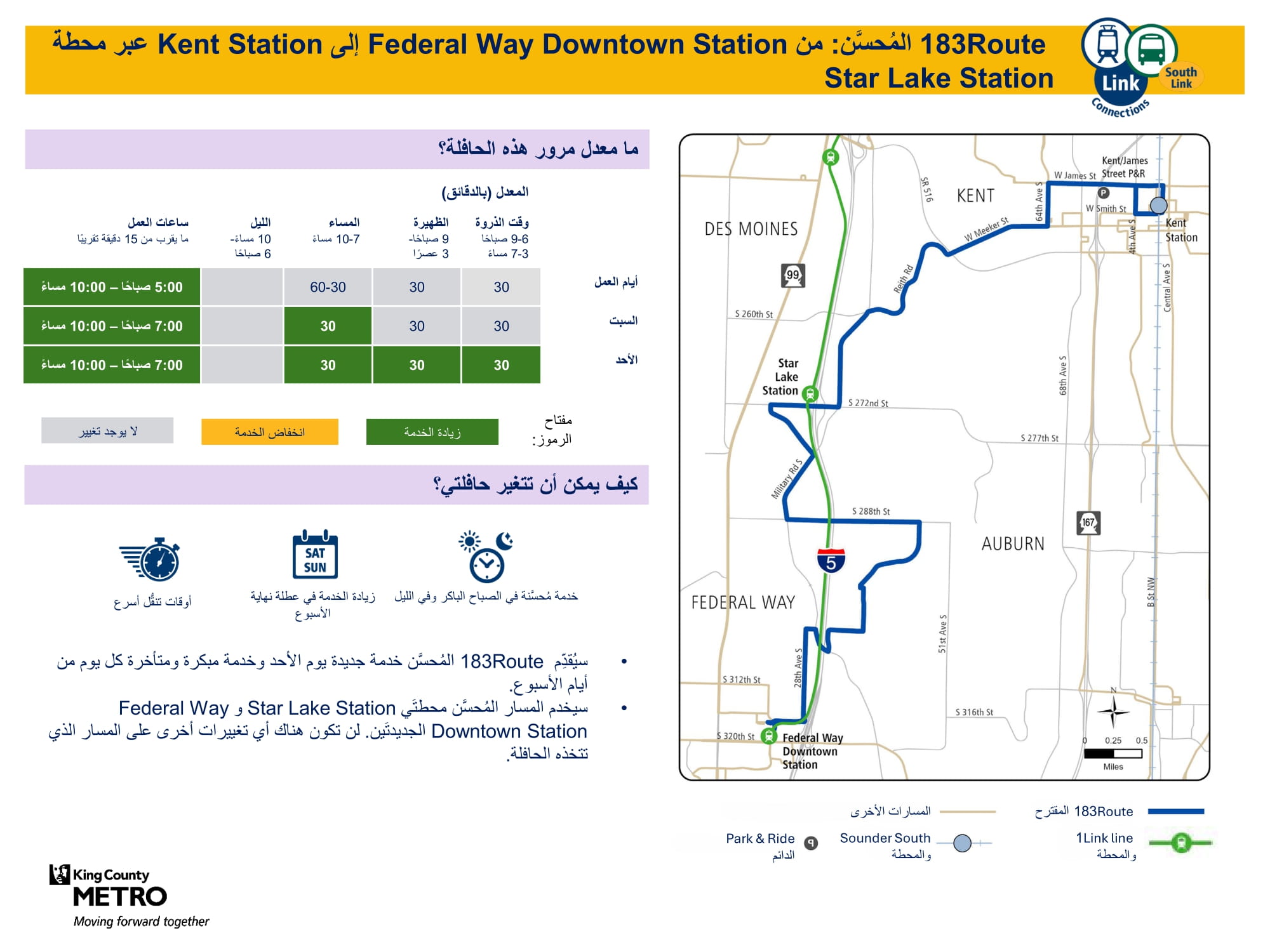 تحسين الخدمة الجديدة المقدمة يوم الأحد، وزيادة عدد الرحلات في أيام العمل ويوم السبت. سيتم الاتصال بالقطار الخفيف Link في محطتي Federal Way Downtown وStar Lake. |