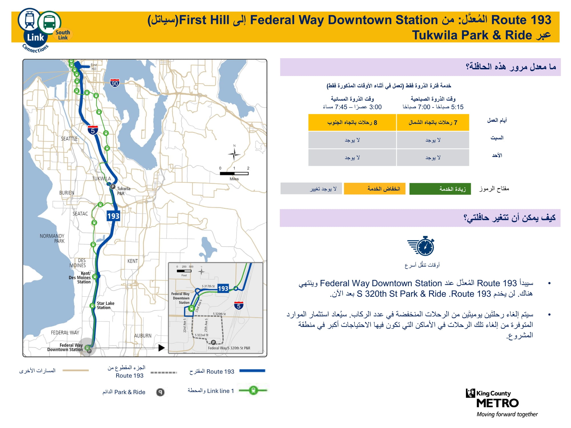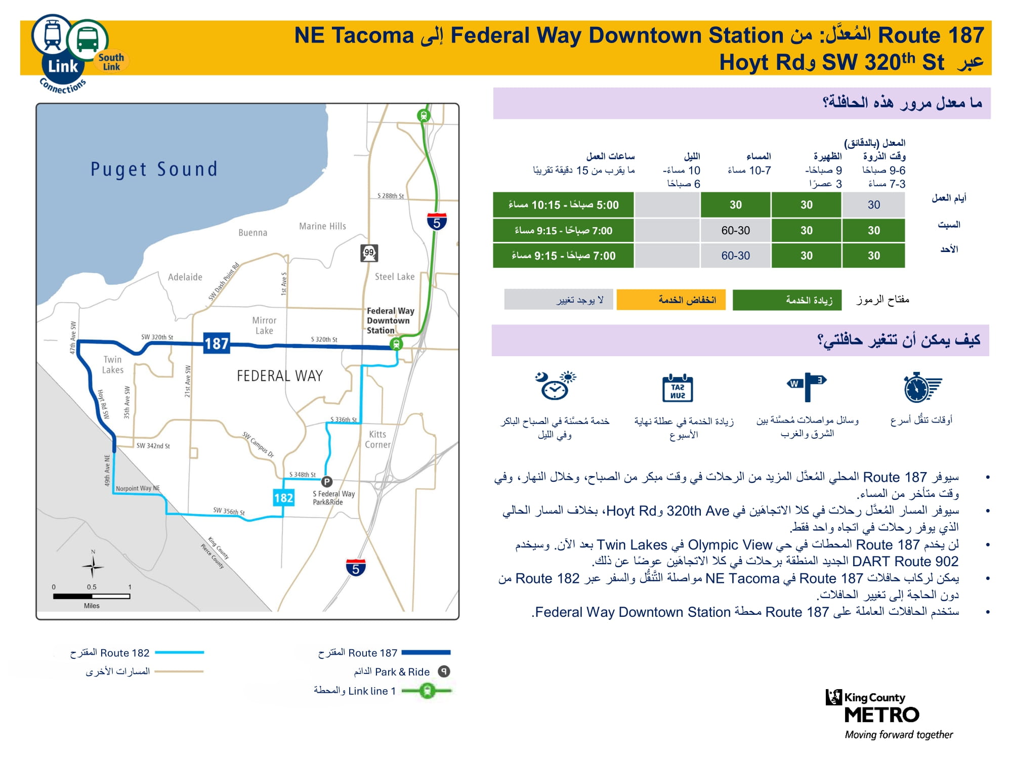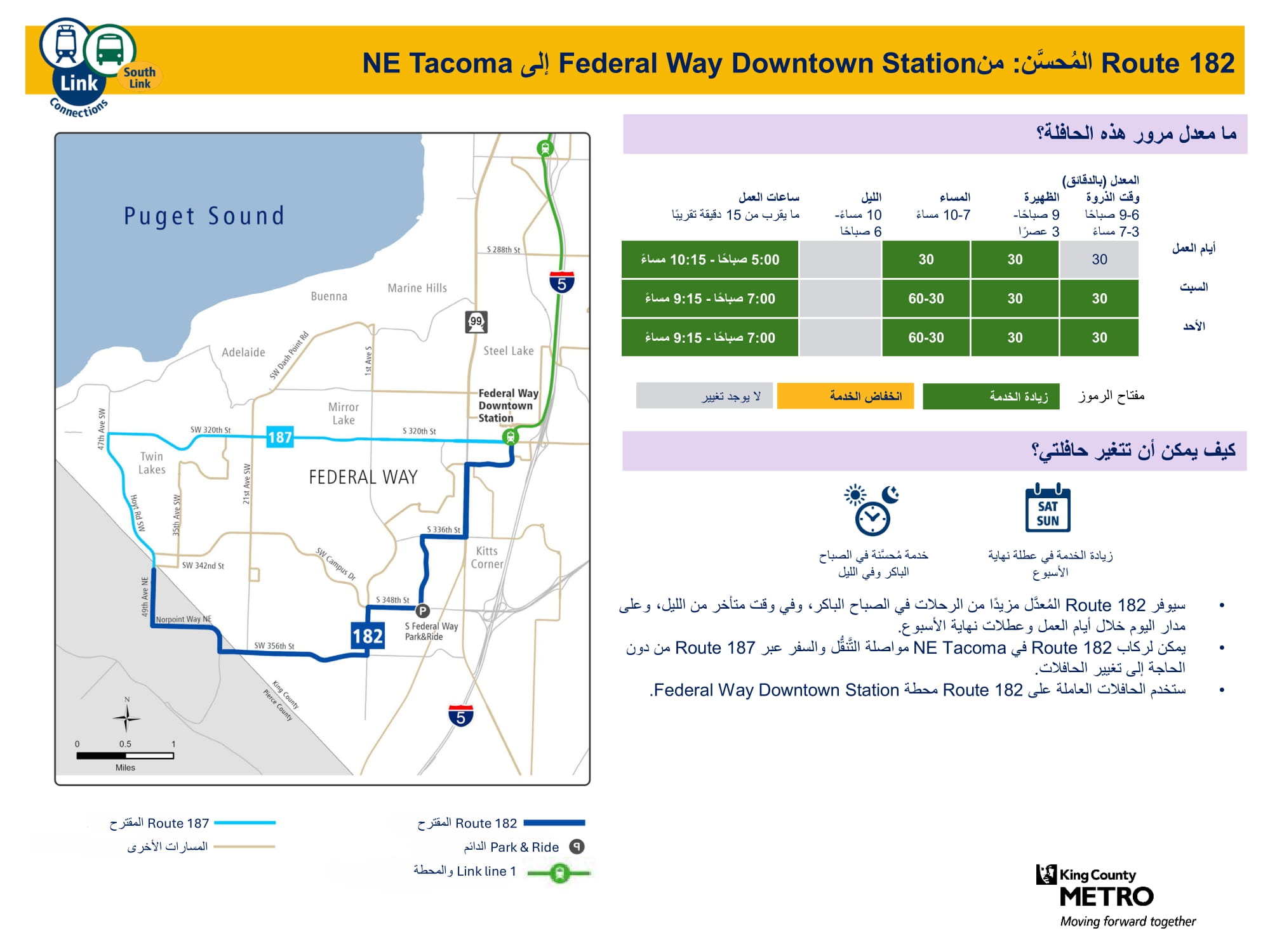 تحسين الخدمة الجديدة المقدمة يوم الأحد، وزيادة عدد الرحلات في أيام العمل ويوم السبت. سيتم الاتصال بالقطار الخفيف Link في محطتي Federal Way Downtown وStar Lake. |