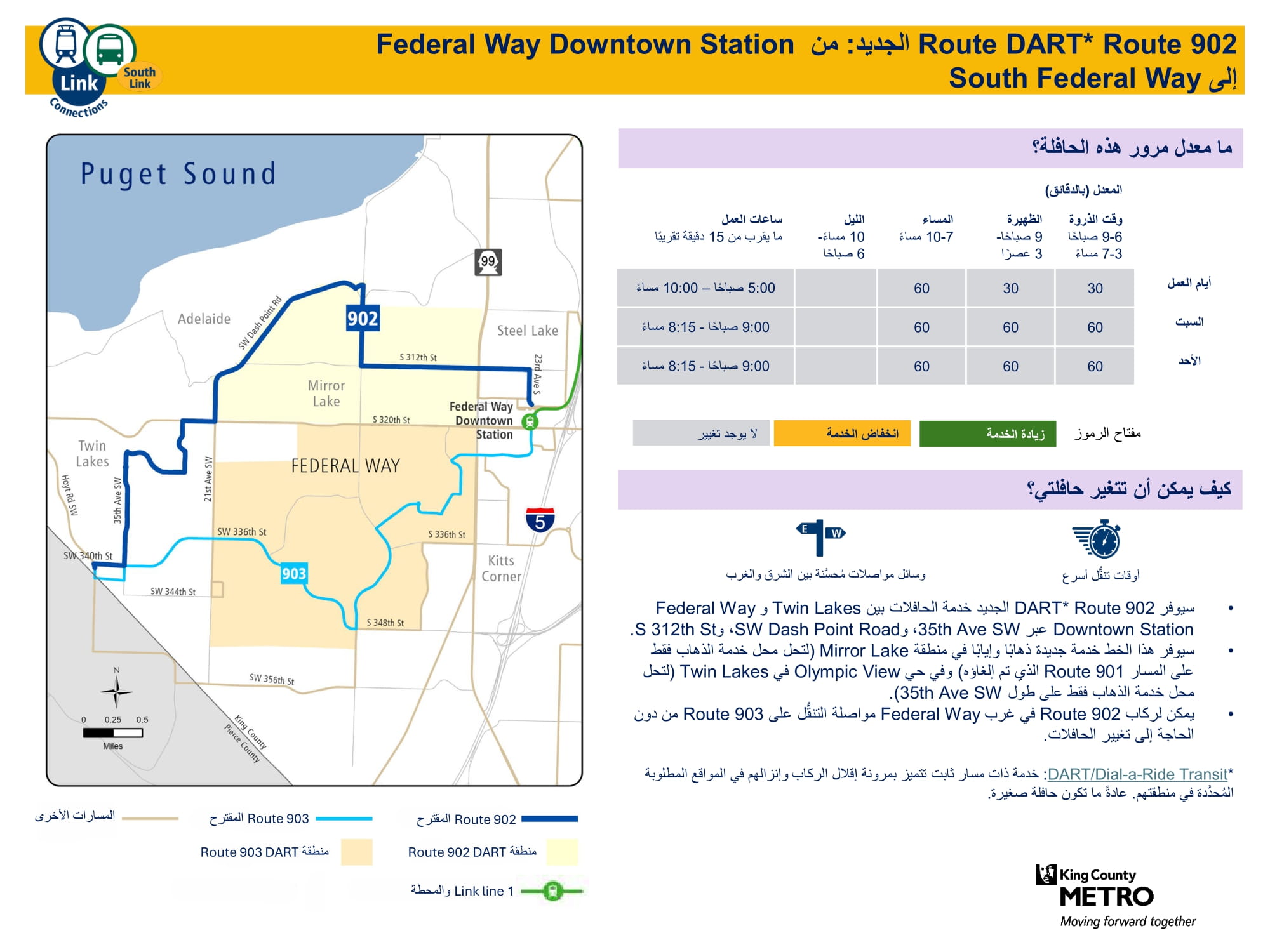 خط DART جديد. يستبدل جزئيًا خط DART رقم 901 مع المزيد من الرحلات طوال أيام الأسبوع. سيتم الربط بالقطار الخفيف Link في محطة Federal Way Downtown. |