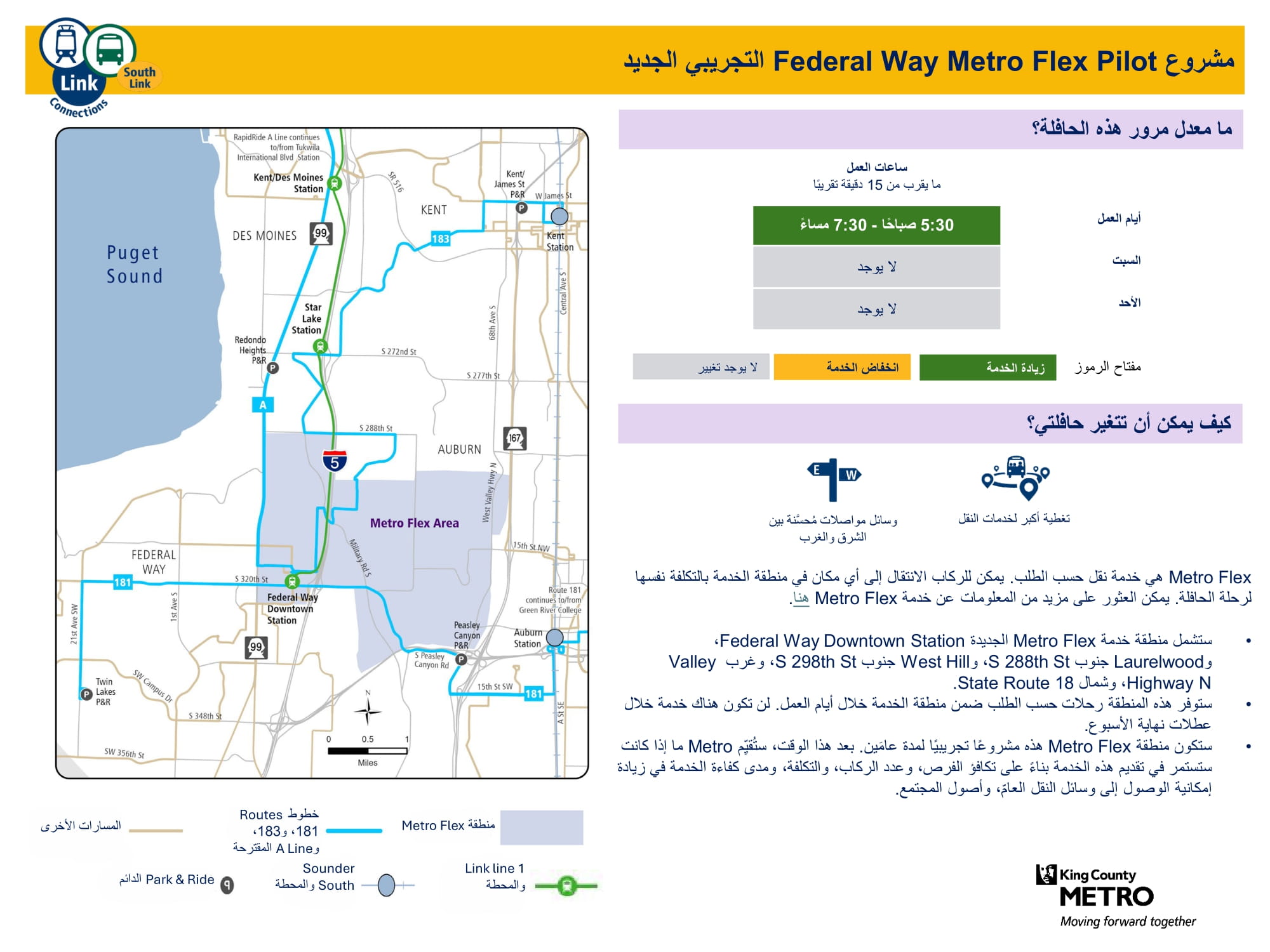 | مشروع Federal Way Metro Flex Pilot التجريبي الجديد يخدم Federal Way، وAuburn | منطقة تجريبية جديدة لخدمة Metro Flex توفّر خدمة حسب الطلب من الإثنين إلى الجمعة. تخدم محطة Federal Way Downtown، وLaurelwood جنوب S 288th St، وWest Hill جنوب S 298th St، غرب W Valley Highway N، وشمال State Route18. |
