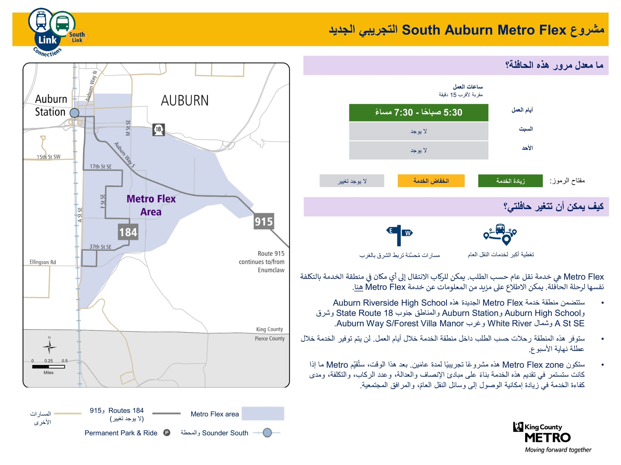 | مشروع Metro Flex التجريبي الجديد جنوب Auburn يخدم Auburn | منطقة تجريبية جديدة لخدمة Metro Flex توفّر خدمة حسب الطلب من الإثنين إلى الجمعة. تخدم المناطق جنوب الطريق السريع 18، شرق A Street SE، شمال White River وغرب Auburn Way S/Forest Villa Manor. تشمل محطة Auburn وRiverside High School. |