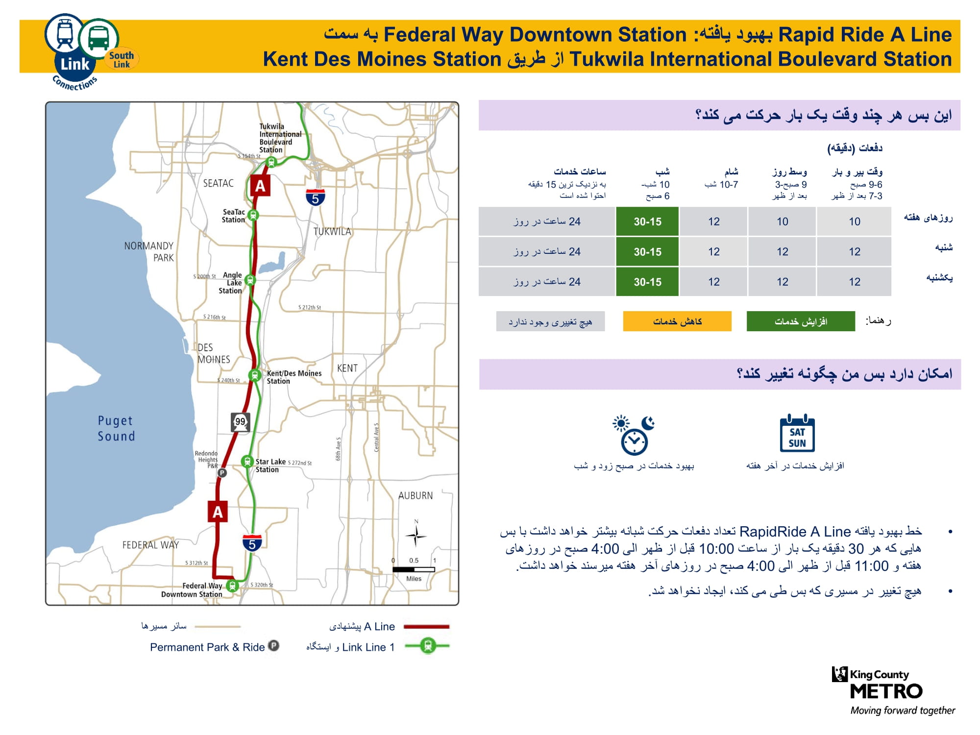 | RapidRide A Line به Federal Way، Des Moines، Kent، SeaTac، Tukwila خدمت مینماید |