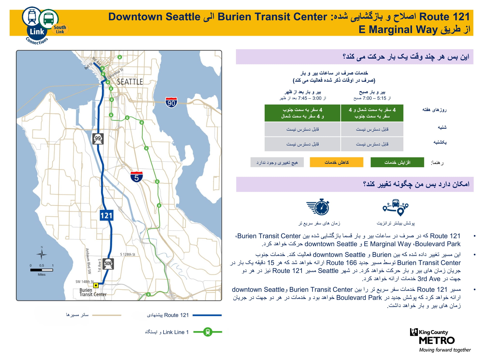 در انتظار تأیید شورای مقاطعه کینگ، اجرای تغییرات برنامهریزیشده باقیمانده با تغییر خدمات در اگست 2026 آغاز خواهد شد. عملی کردن هر تغییر در خدمات Metro بر اساس ظرفیت نیروی کار انجام میشود تا از ارائه قابل اعتماد خدمات اطمینان حاصل شود، که امکان دارد نیاز به تغییرات در بخش های مختلف داشته باشد. معلومات بیشتر در مورد زمان اعمال تغییرات خاص، در ویبسایت تغییرات خدمات Metroقابل دسترس خواهد بود. همچنان تغییرات خدمات در ویبلاگ Metro Matters اعلام میگردد. برای دریافت معلومات تازه ثبتنام کنید.