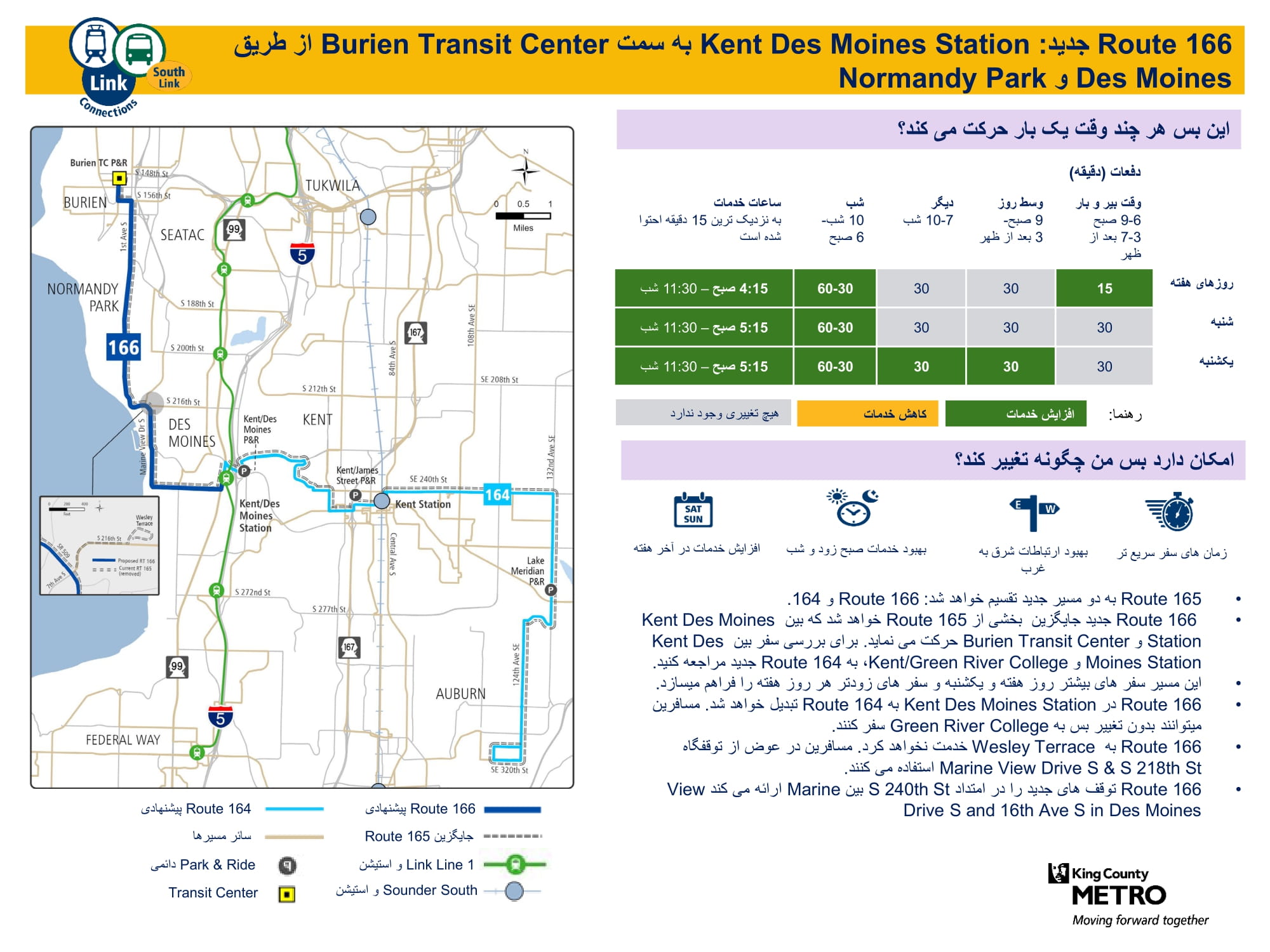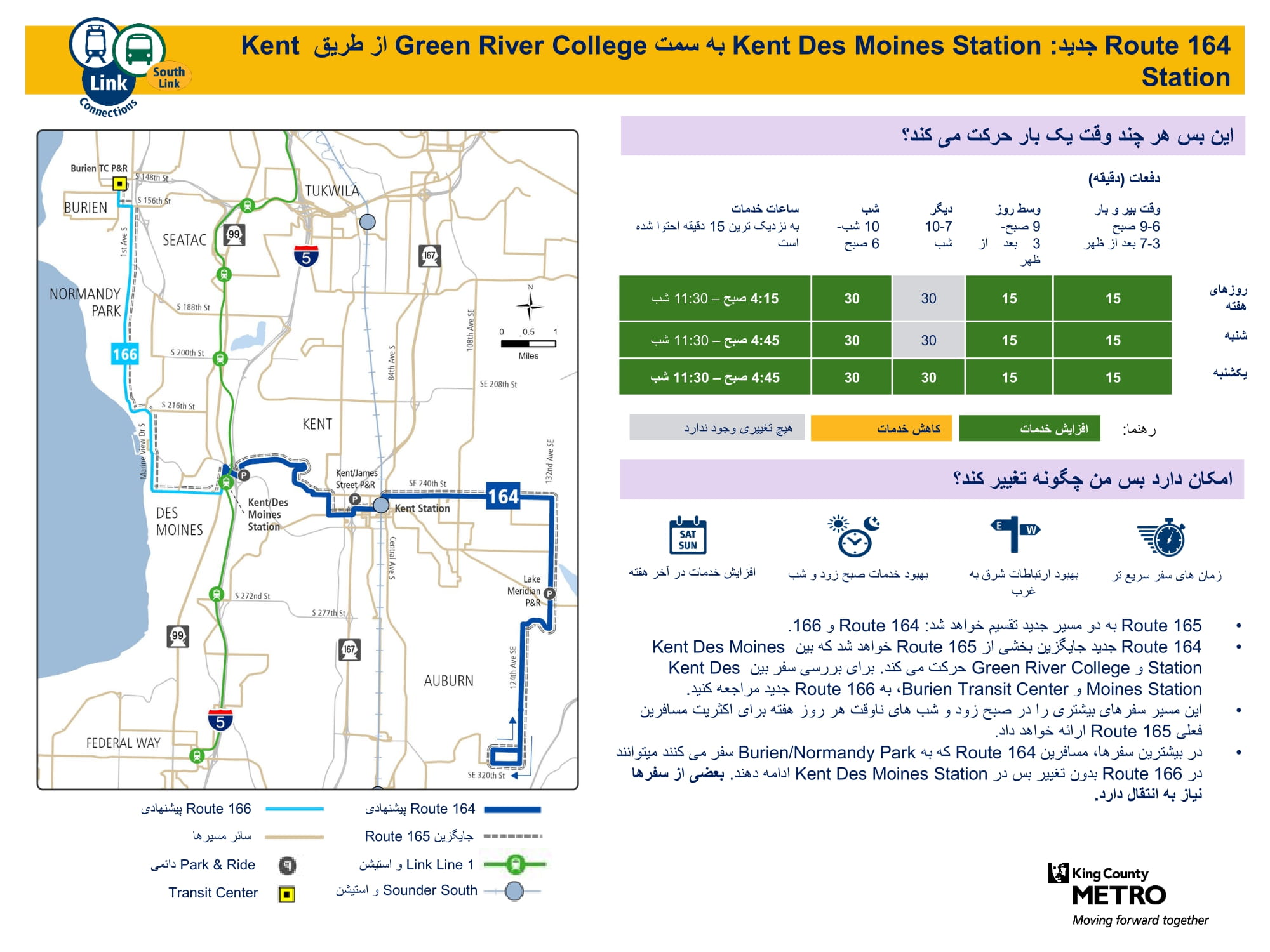 مسیر جدید و پرتردد با سفرهای بیشتر در هر روز هفته. با بخشی از مسیر بس 165 جایگرین می شود. باریل سبک Link در ایستگاه Kent Des Moines وصل خواهد شد. تمام سفرها برای مسافرین که فراتر از ایستگاه Kent Des Moines سفر می کنند به سفرهای مسیر 164 تبدیل خواهد شد. ببینید چگونه مسیرهای 164 و 166 فعالیت خواهند کرد |