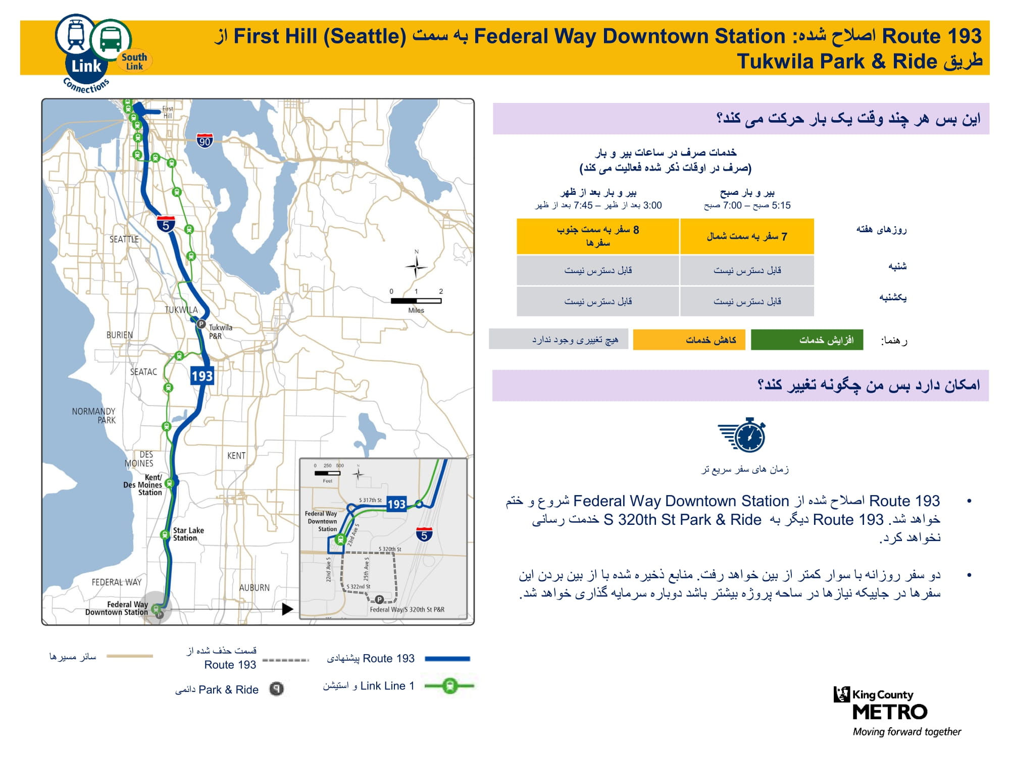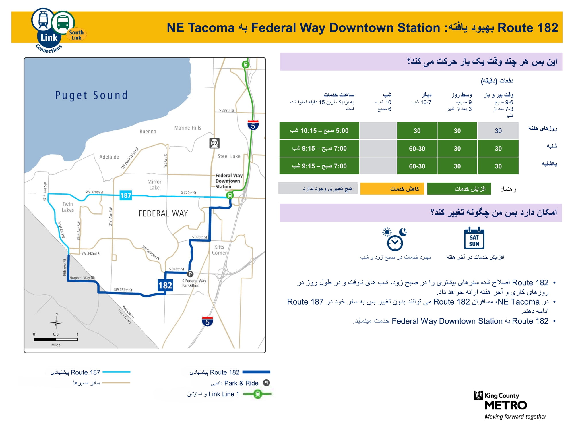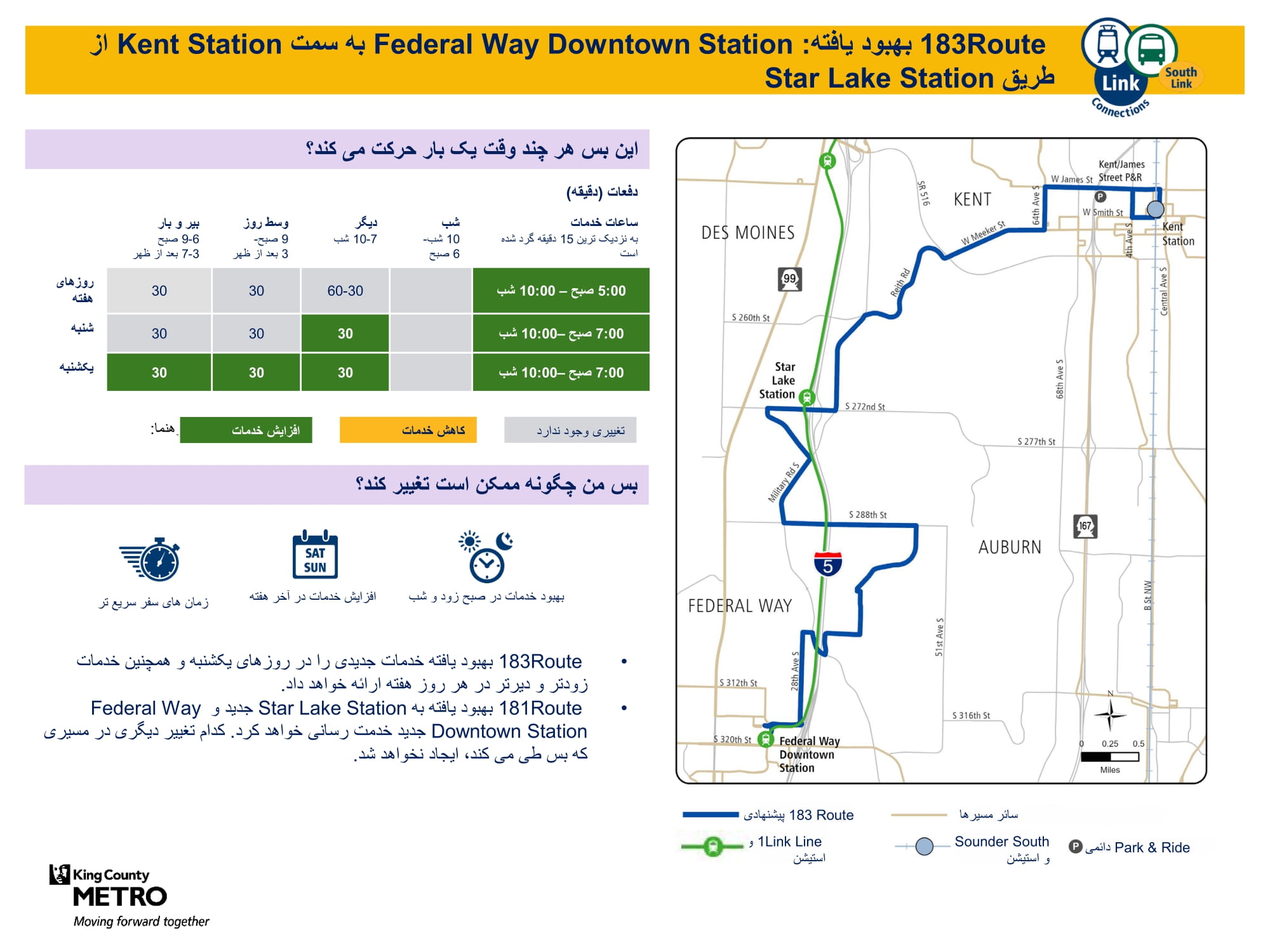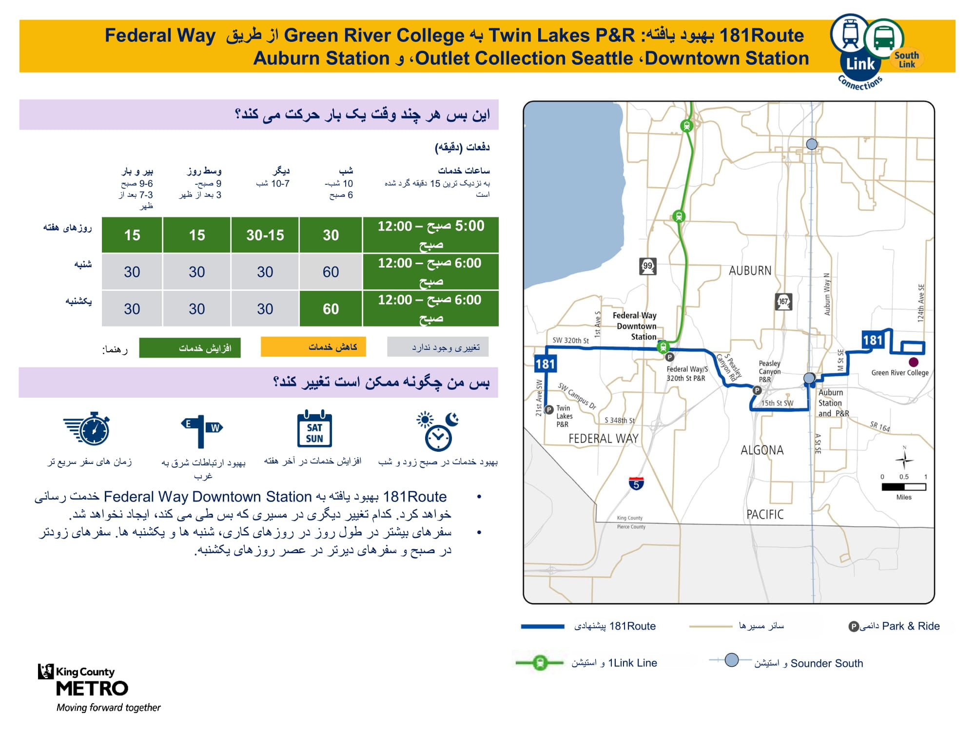 | برنامه آزمایشی Federal Way Metro Flex به Auburn ،Federal Way خدمت مینماید | زون آزمایشی جدید Metro Flex که خدمات بر اساس تقاضا را از دوشنبه تا جمعه فراهم میسازد. ارائه خدمات به ایستگاه Federal Way Downtown، Laurelwood جنوب S 288th St و West Hill جنوب S 298th St، غرب W Valley Highway N، و شمال مسیر بس ایالتی 18. |