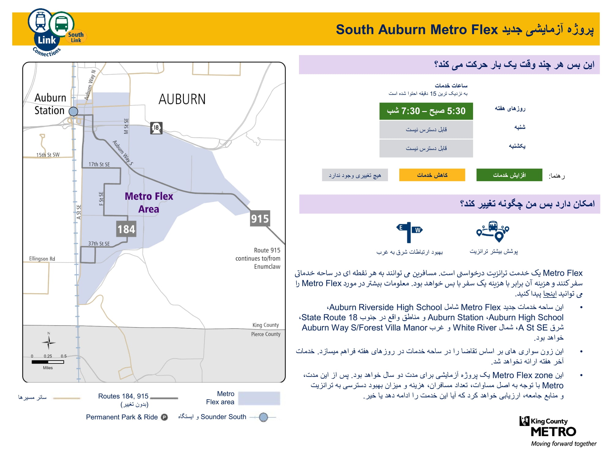 | برنامه آزمایشی Auburn Metro Flex جنوبی به Auburn خدمت مینماید | زون آزمایشی جدید Metro Flex که خدمات بر اساس تقاضا را از دوشنبه تا جمعه فراهم میسازد. ساحات خدمت کننده جنوب مسیر بس ایالتی 18، شرق A Street SE، شمال White River و غرب Auburn Way S/Forest Villa Manor. شامل ایستگاهAuburn و Riverside High School می شود. |