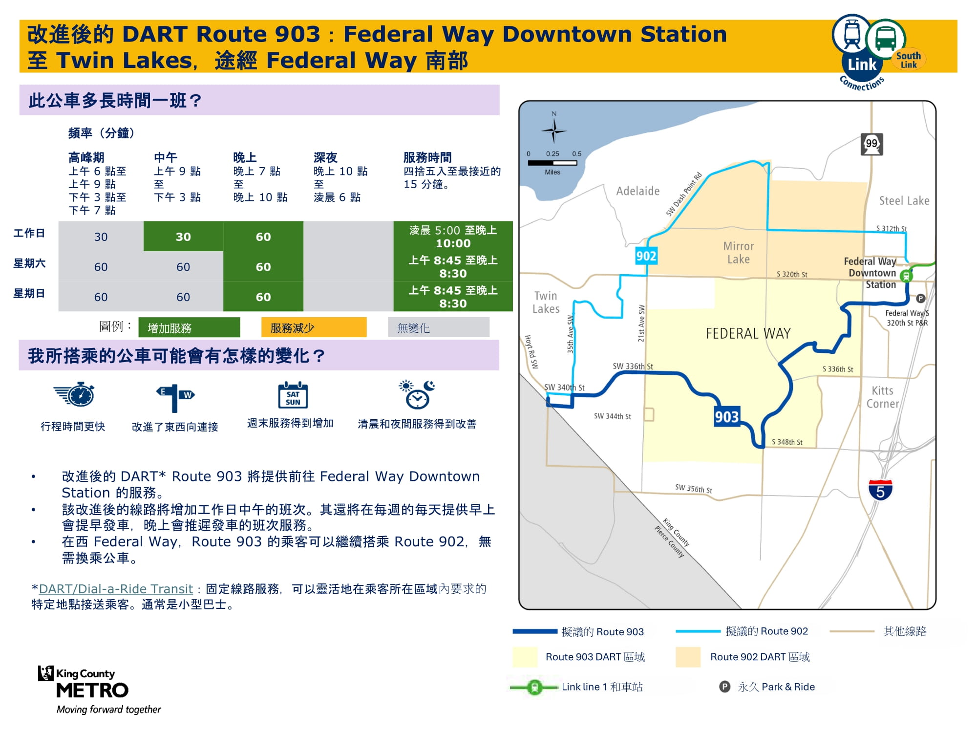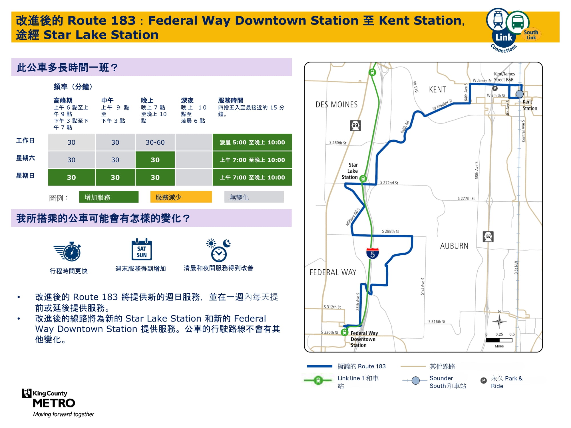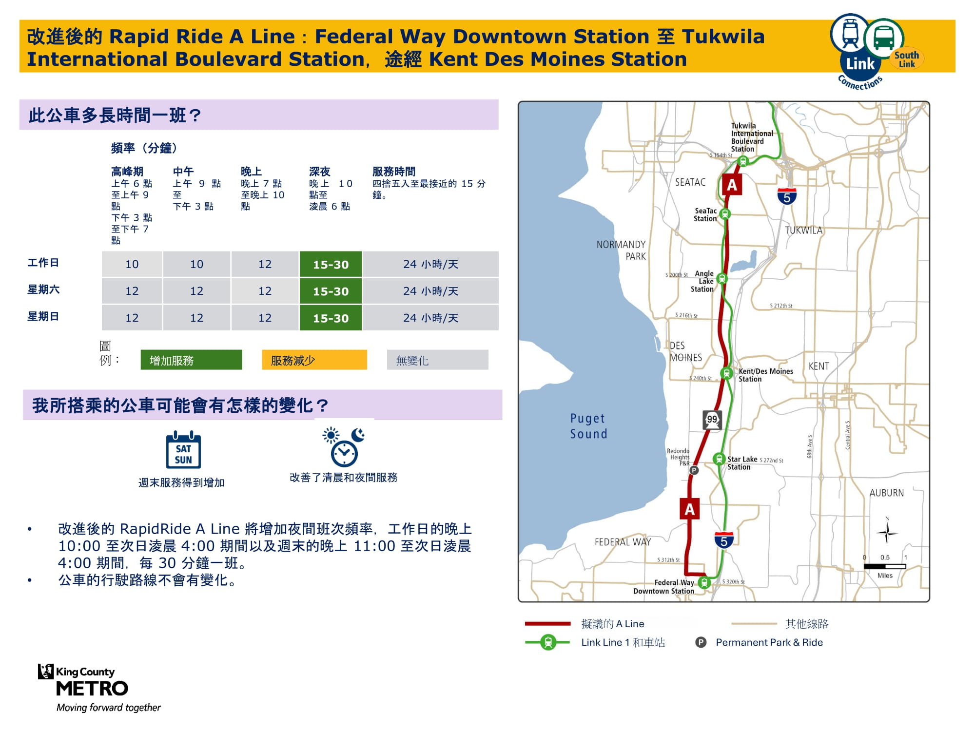 透過新增週日班次並在工作日和週六增加班次來提升服務。將在 Federal Way Downtown 和 Star Lake 站與 Link 輕軌銜接。 |