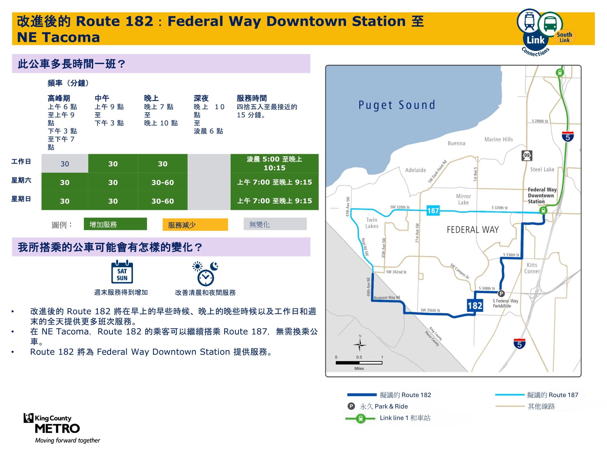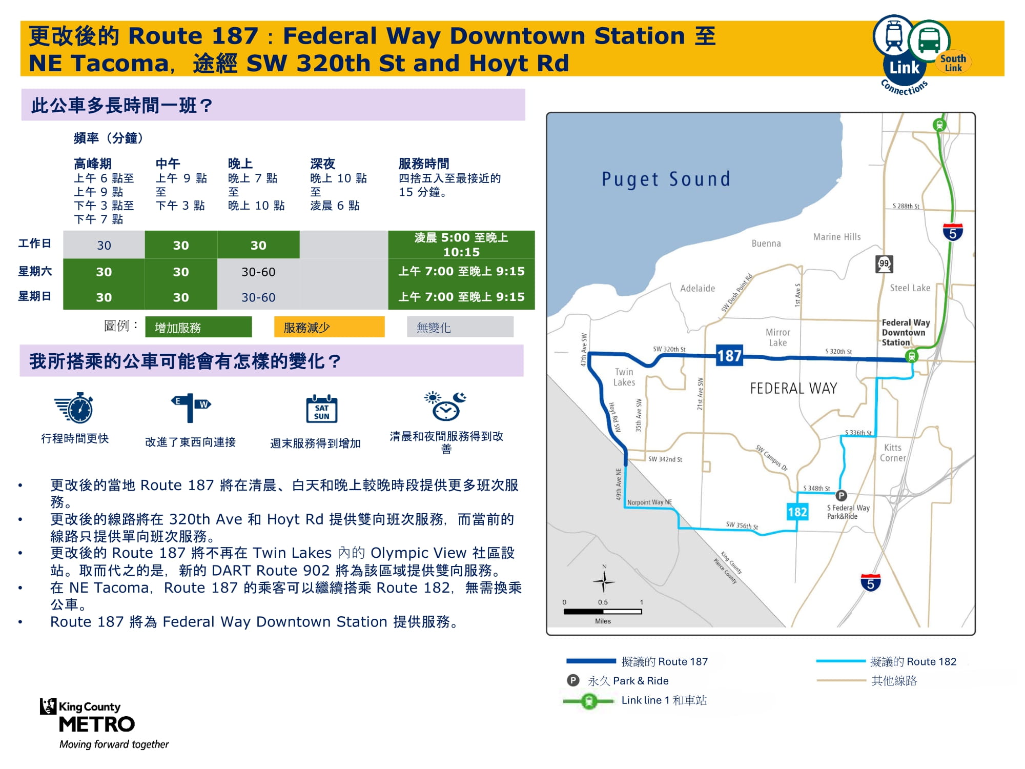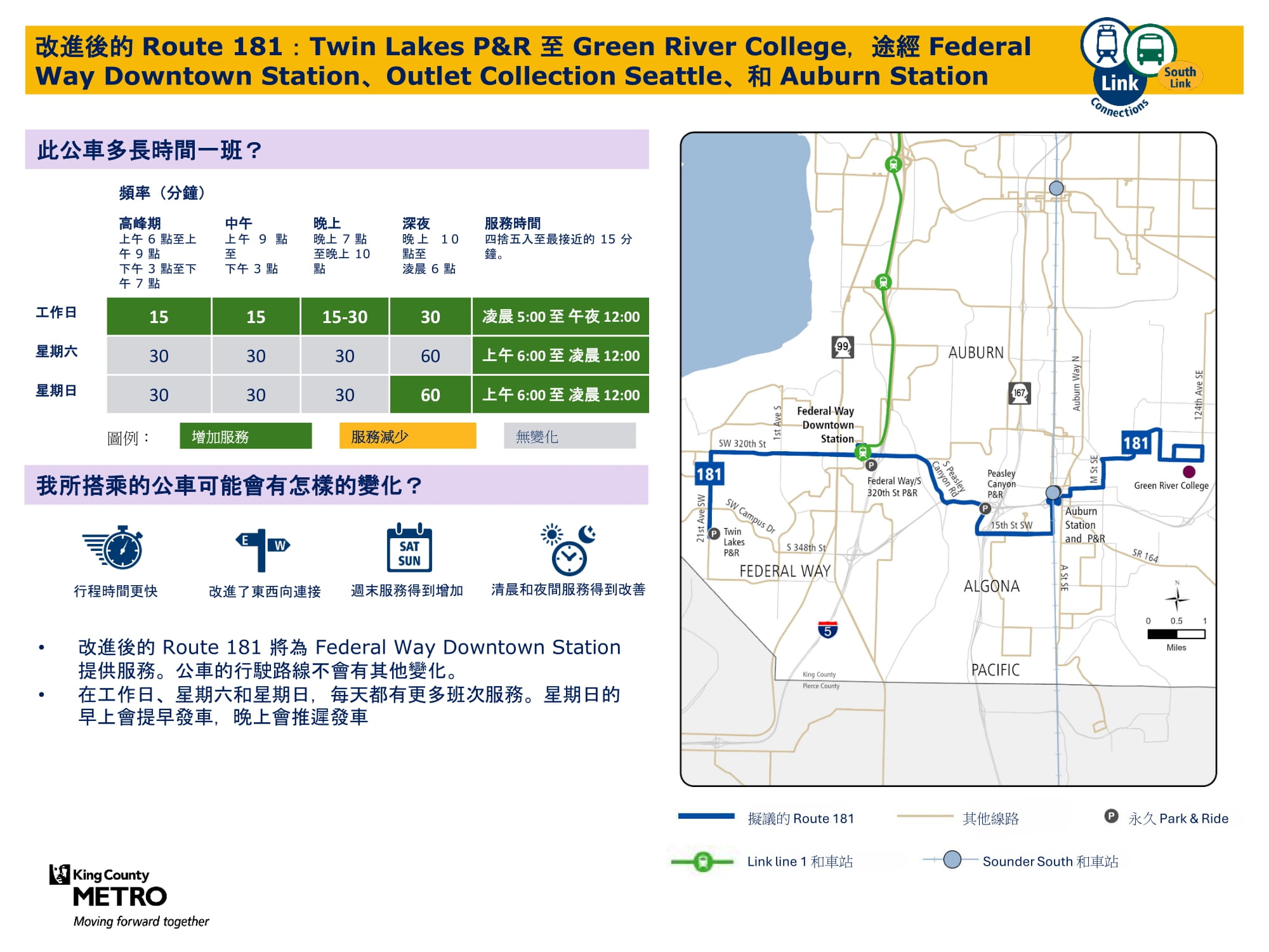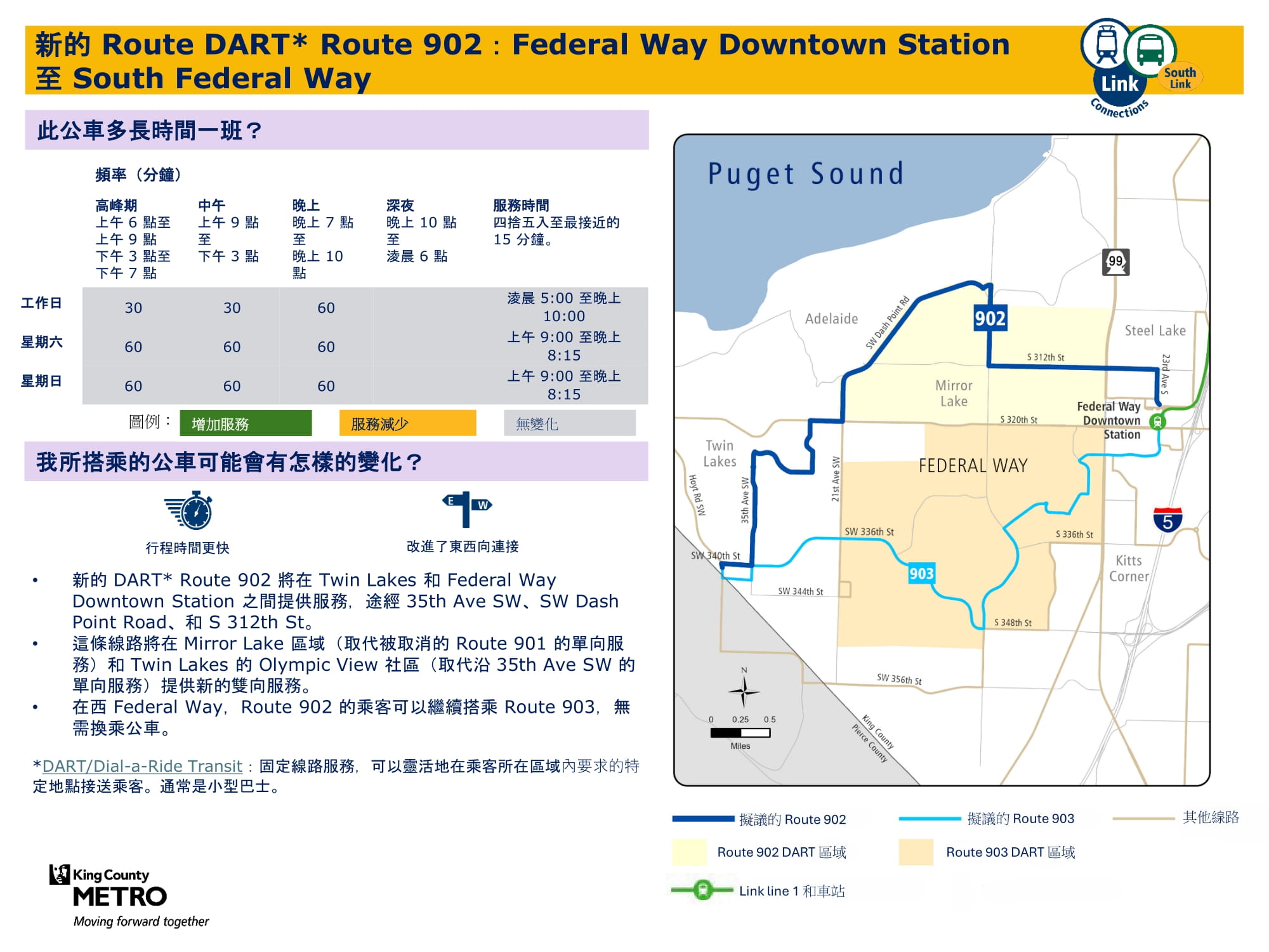 透過新增週日班次並在工作日和週六增加班次來提升服務。將在 Federal Way Downtown 和 Star Lake 站與 Link 輕軌銜接。 |
