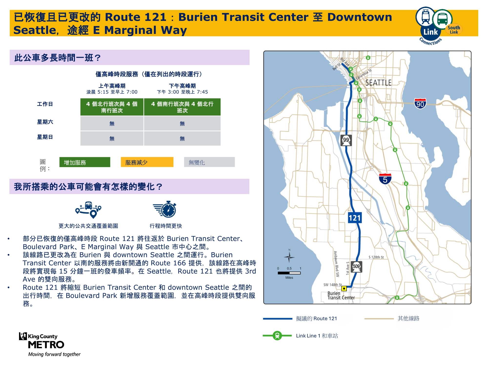 隨著 Link 輕軌進一步向南延伸,在 Kent/Des Moines、Star Lake 和 Federal Way 市中心新增三座車站,South Link Connections 專案旨在改善南金縣社區的公共交通選擇。Metro 與 Sound Transit (在新分頁卡中打開) 及其他合作夥伴根據社區意見,共同規劃並打造了全新的公共交通網路,更加滿足當地居民的出行需求。