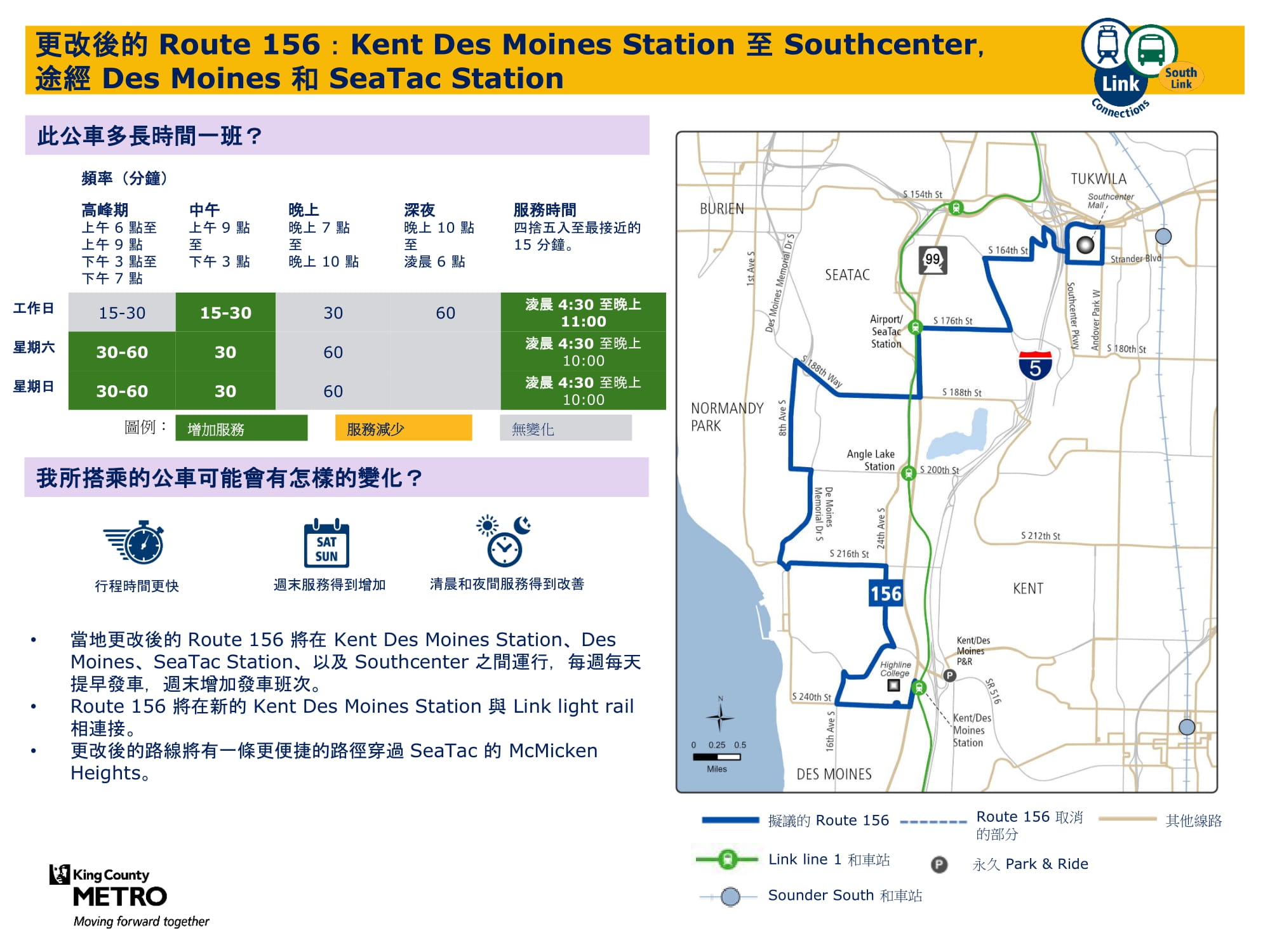 | 156 為 Kent、Des Moines、SeaTac、Tukwila 提供服務 |