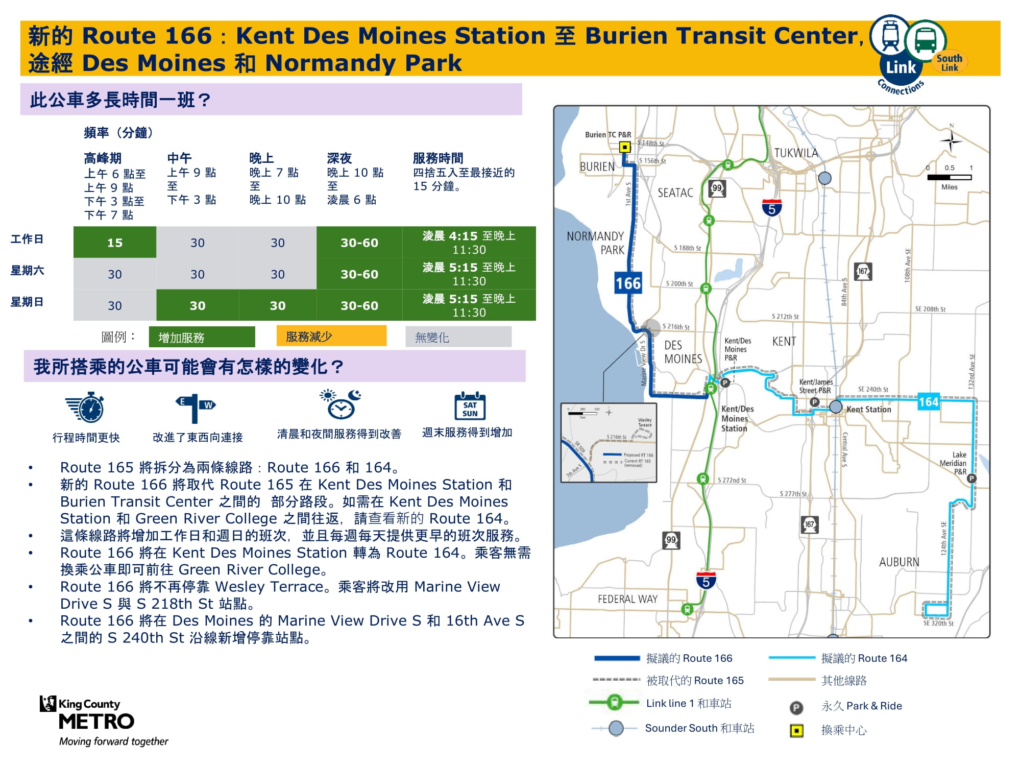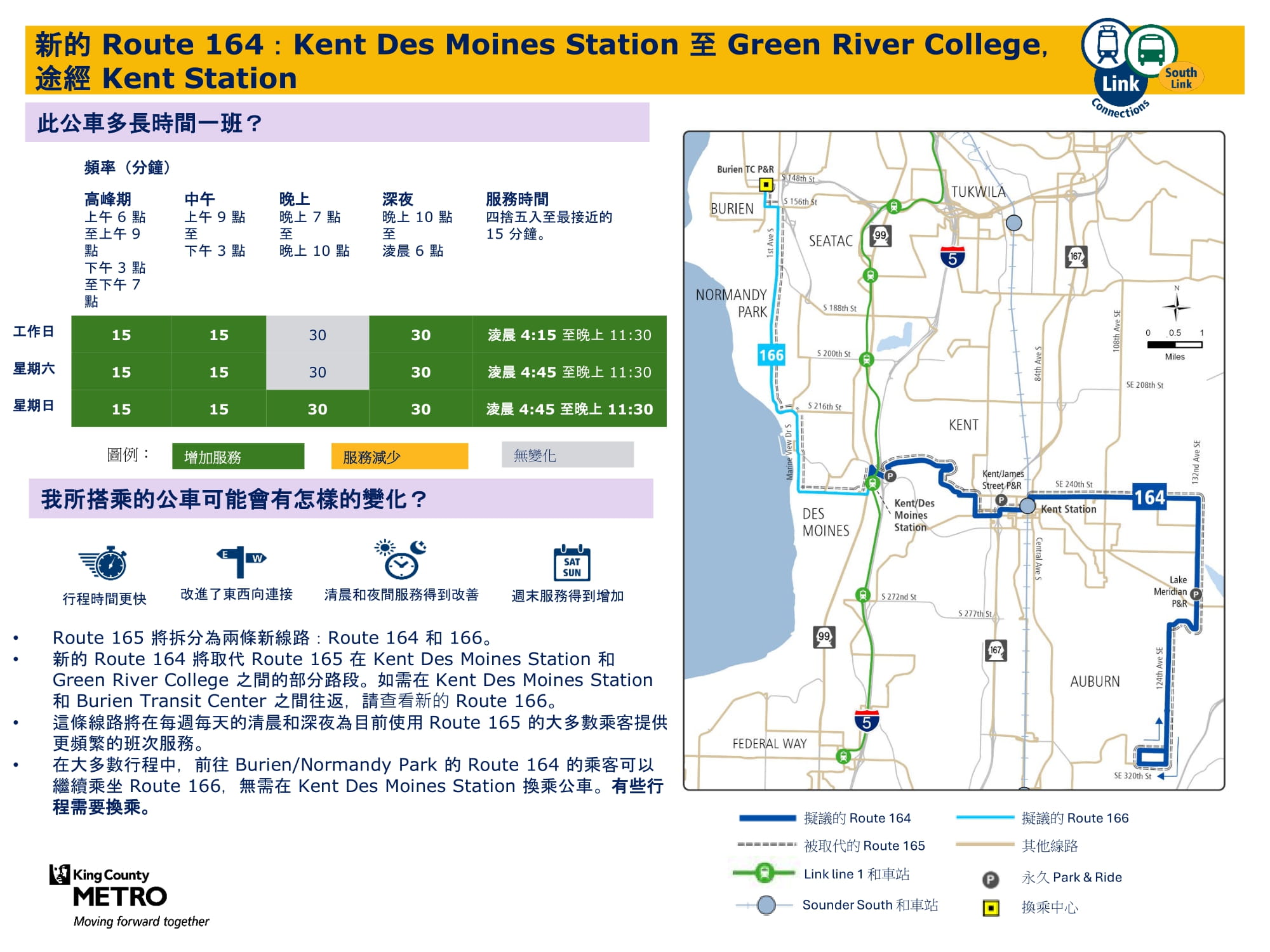 這是一條新的高峰高頻路線,每天班次增加,並取代原 165 路的部分路段。乘客可在 Kent Des Moines 站換乘 Link 輕軌。對需前往 Kent Des Moines 站以外的乘客,所有 166 路班次將轉換為 164 路繼續營運。 查看路線164和166如何運行 |