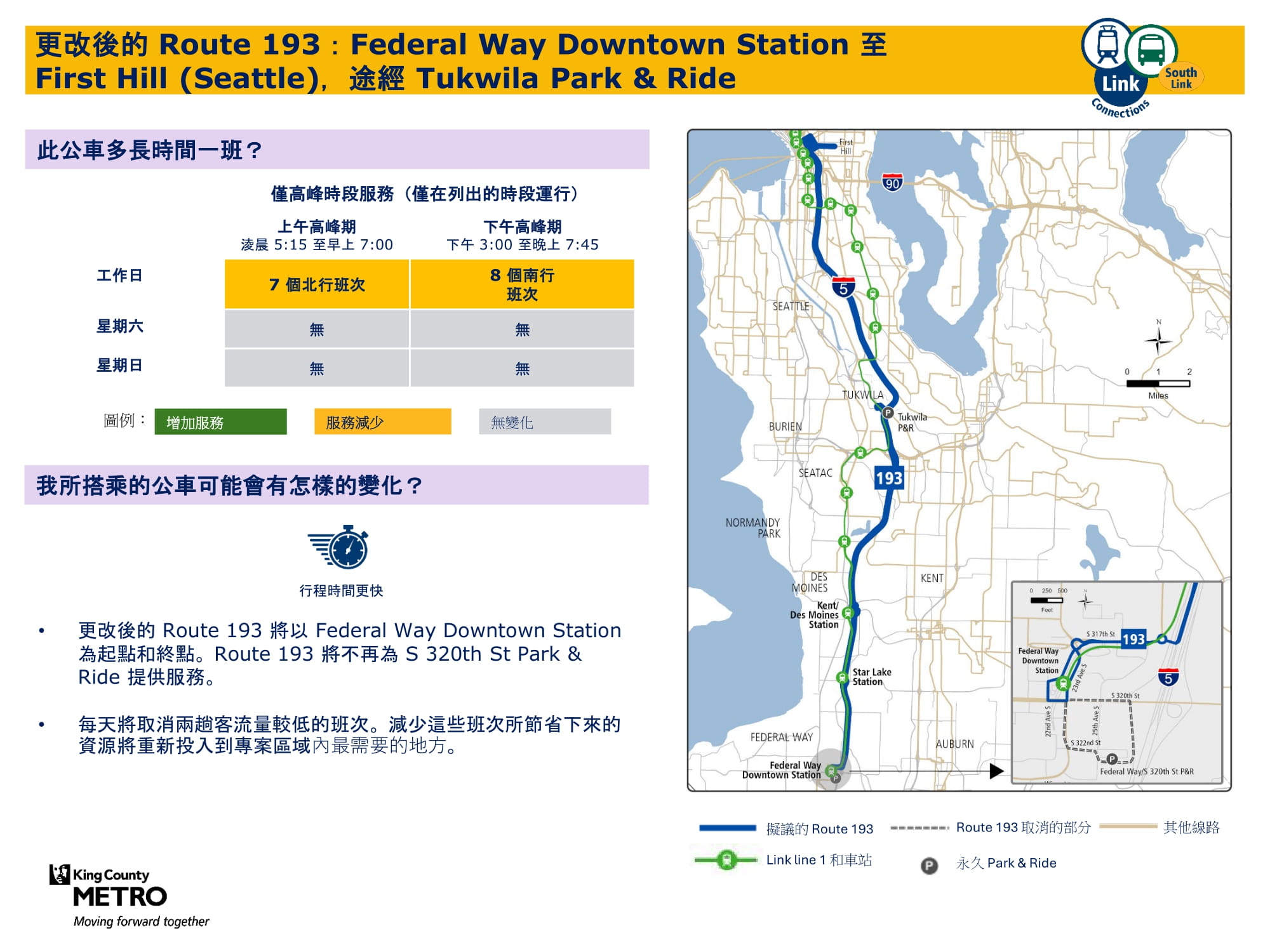 已修改 Federal Way Downtown 站和 Northshore QFC/Shopping Center 之間的 320th Street 雙向服務。增加工作日和週末班次。將在 Federal Way Downtown 站與 Link 輕軌銜接。 |