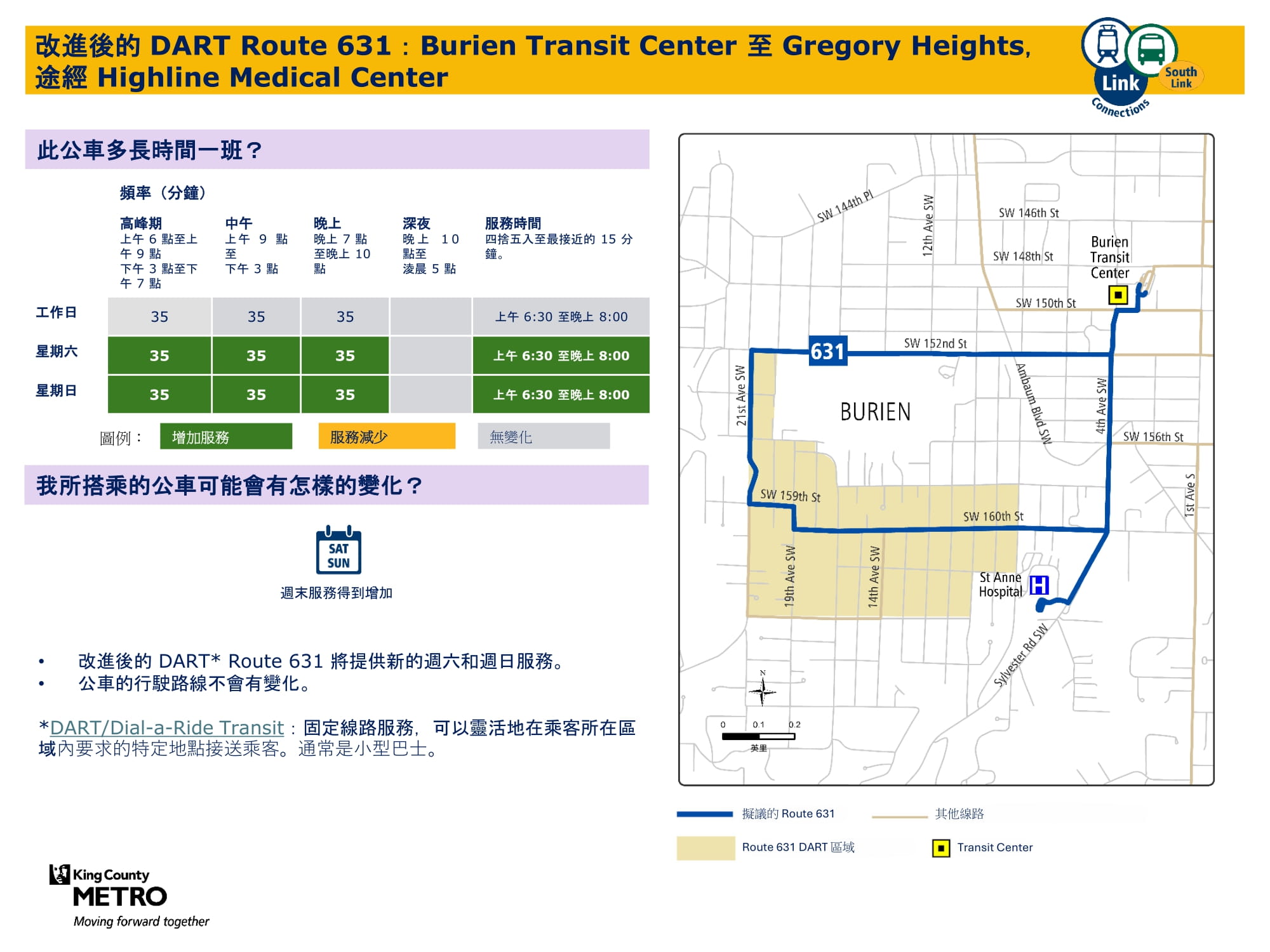- 擴展週末服務: 新增週六和週日服務路線,並提高主要路線週末發車頻率。具體來說,包括在 Burien 新增週末服務,在 Kent 與 Federal Way 之間新增週日服務,以及在 Kent Des Moines 站、Kent 站、Kent East Hill 和 Green River College 之間增加更頻繁的週末班次。與目前相比,最終公共交通網路提案將使週六班次數增加 57%,週日班次數幾乎翻倍。