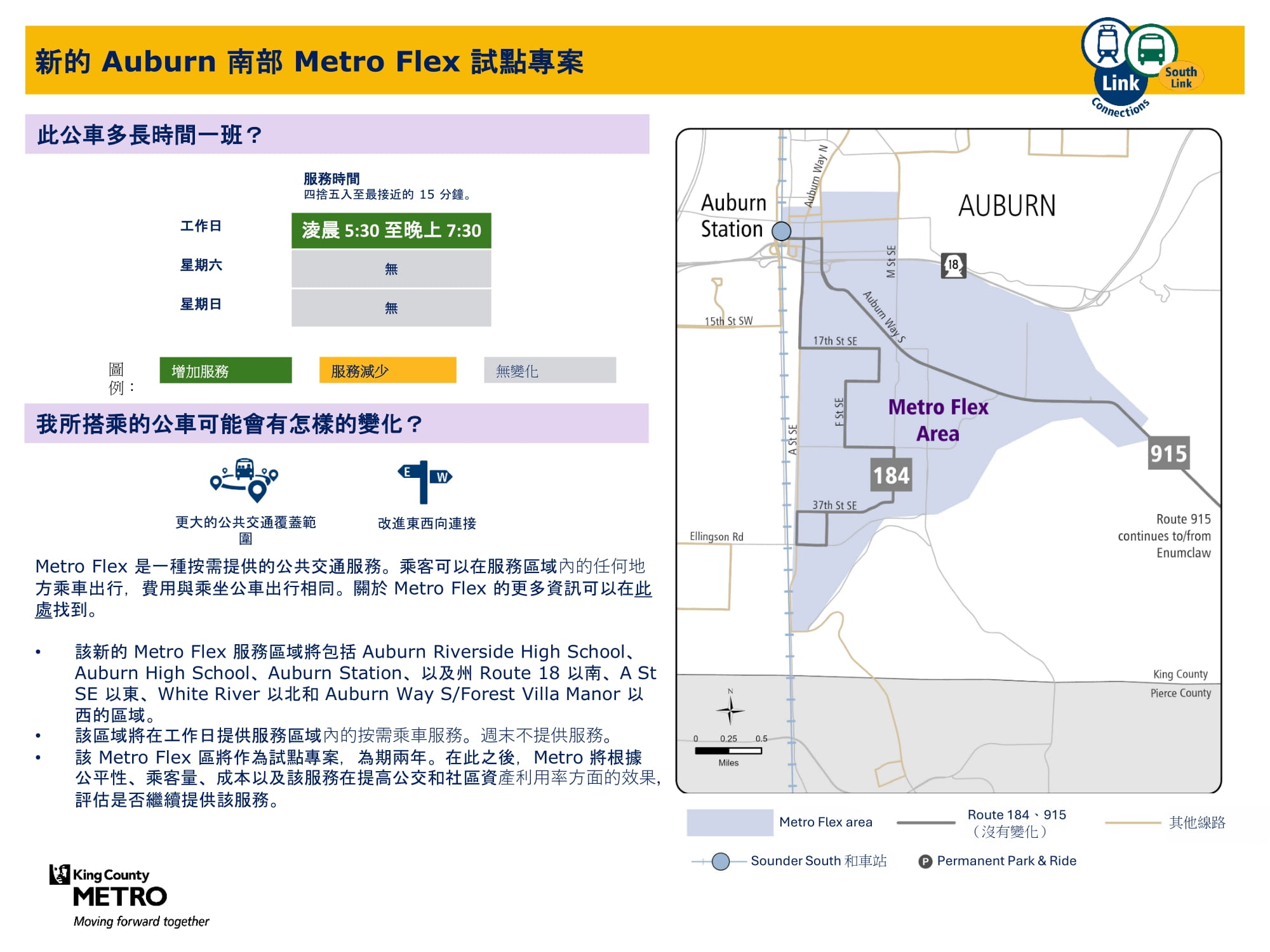 | Auburn 南部 Metro Flex 試點專案 為 Auburn 提供服務 | 新增 Metro Flex 試點區域週一至週五提供按需服務。經停區域包括州際 18路線以南、A Street SE以東、White River 以北和 Auburn Way S/Forest Villa Manor 以西。包括 Auburn 站和 Riverside High School。 |