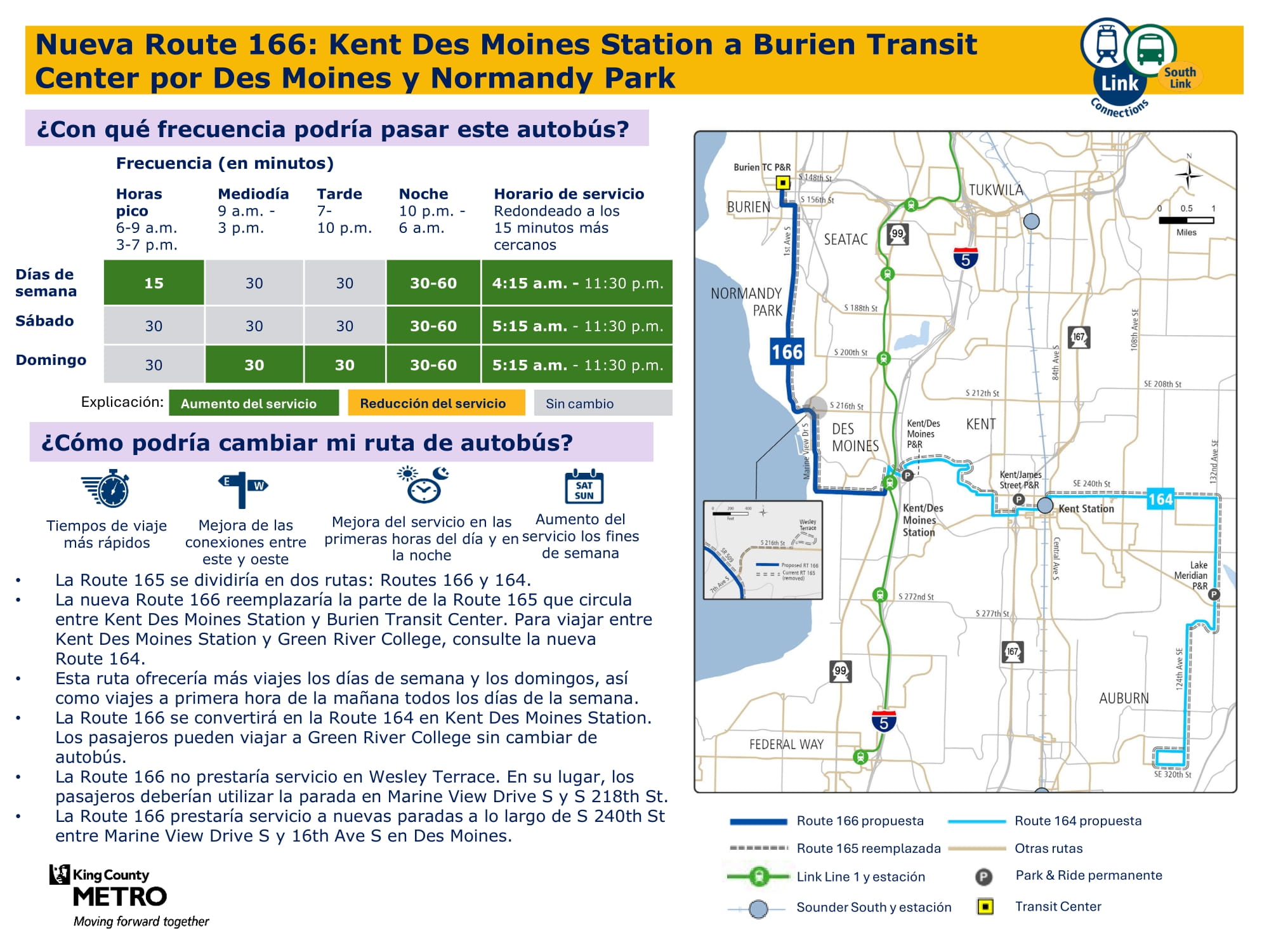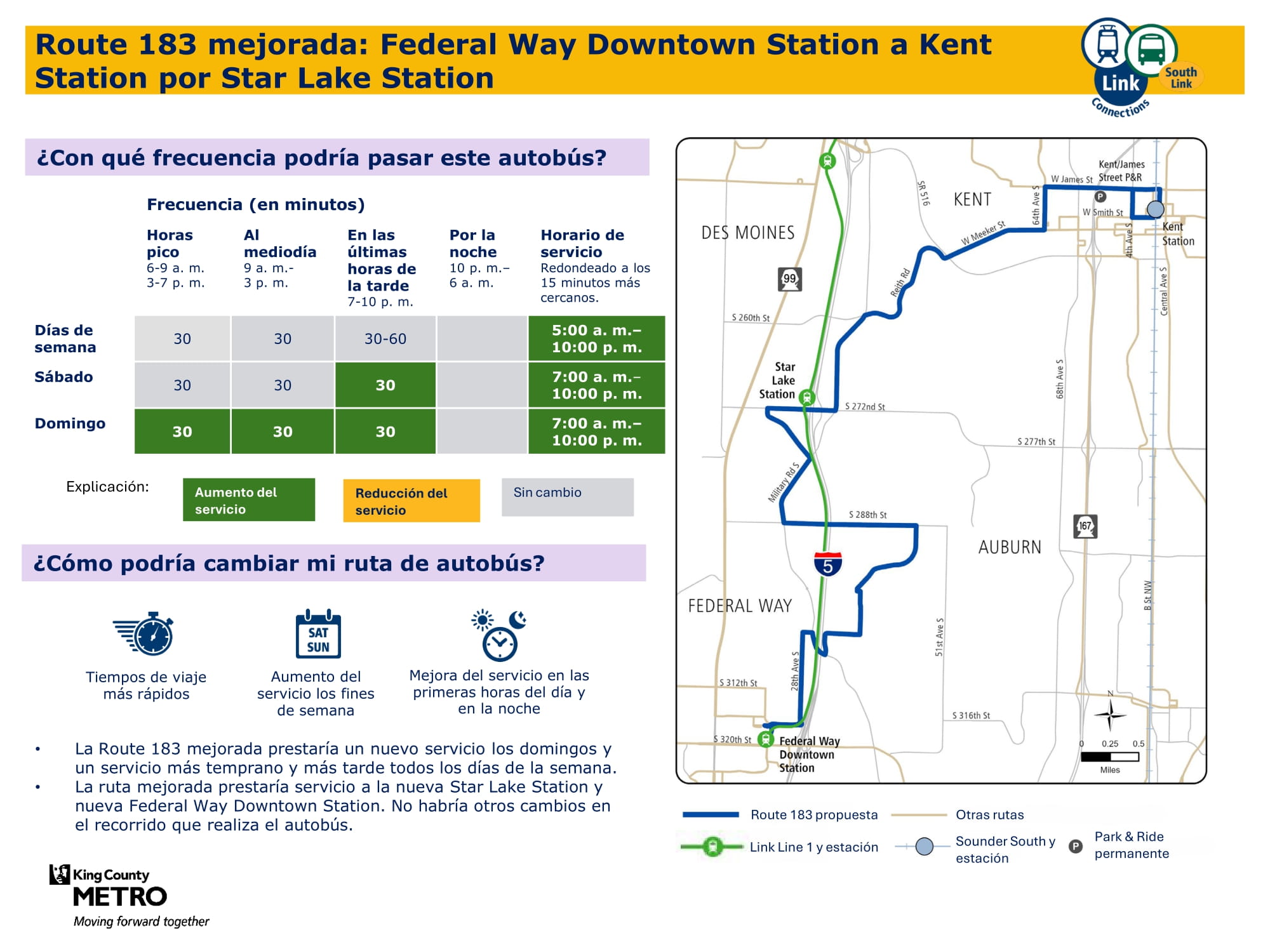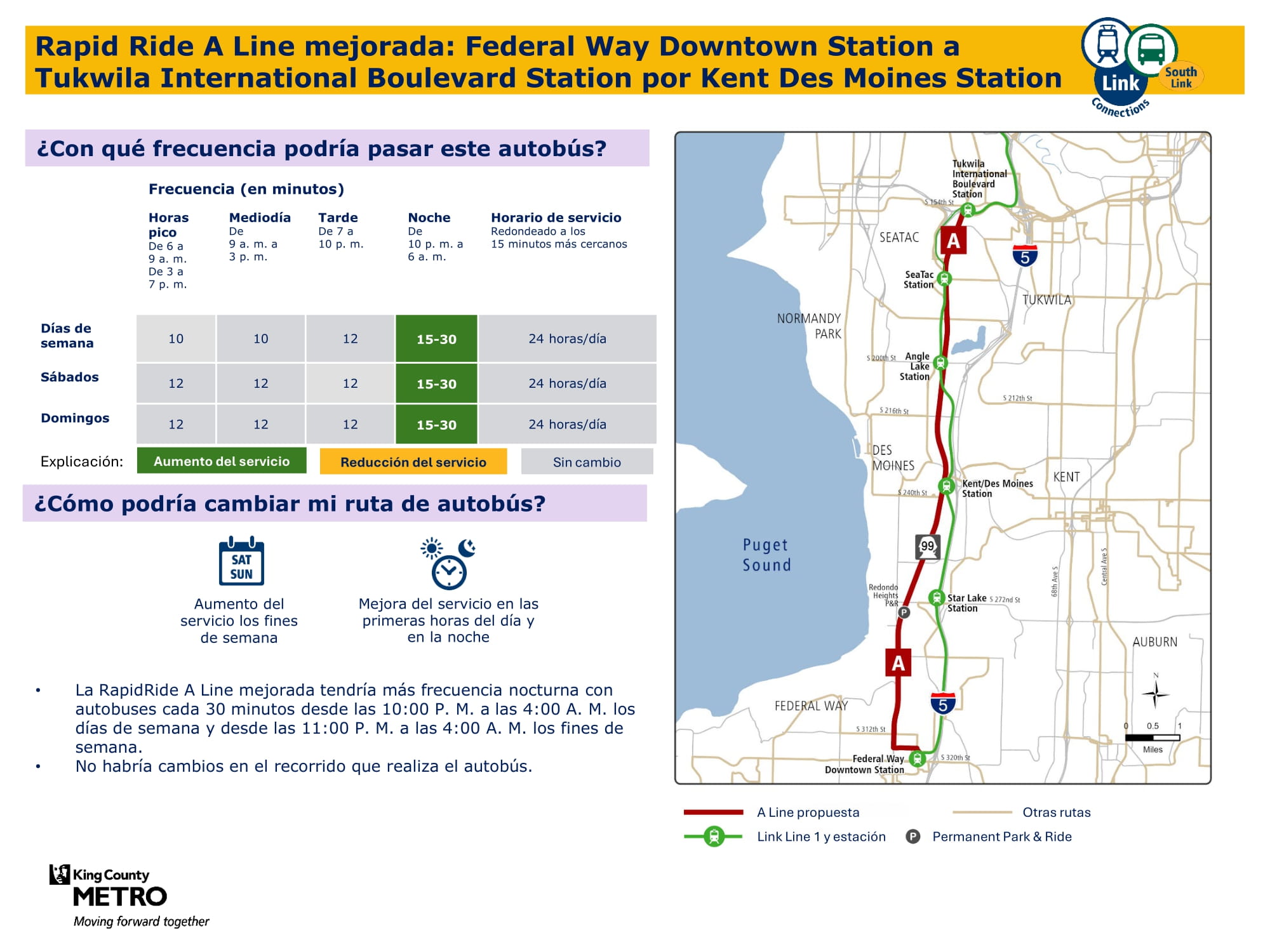 - Ampliación del servicio durante los fines de semana: Se introduce un nuevo servicio los sábados y domingos, y se incrementa la frecuencia durante los fines de semana en los corredores principales. Específicamente, habrá un nuevo servicio de fin de semana en Burien, un nuevo servicio dominical entre Kent y Federal Way y mayor frecuencia de servicio los fines de semana entre la estación Kent Des Moines, la estación Kent, Kent East Hill y Green River College. La propuesta final de la red proporcionará un 57 % más de viajes los sábados y casi el doble de viajes los domingos en comparación con el servicio actual.