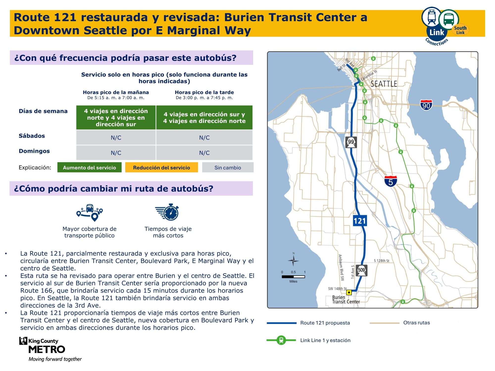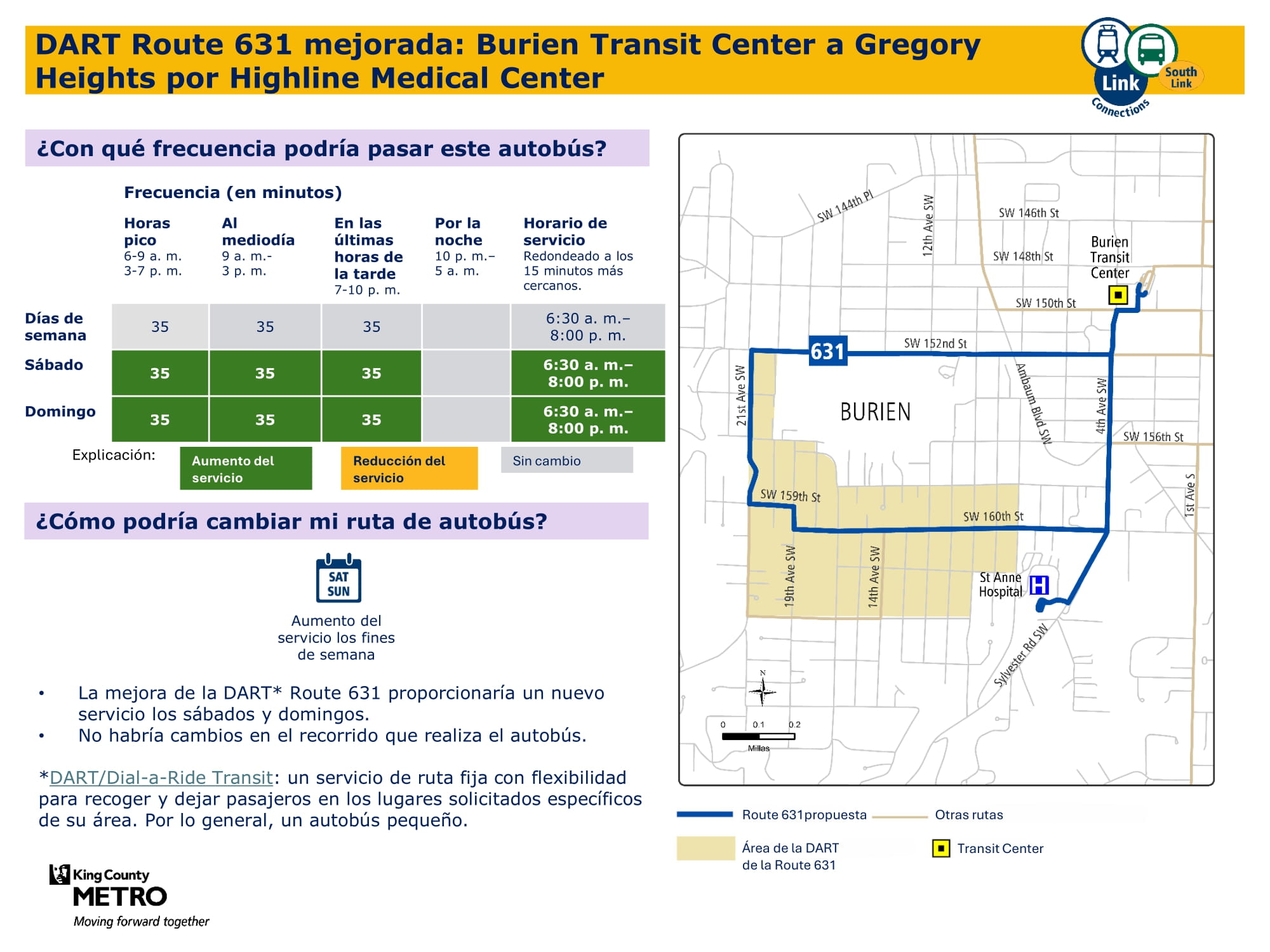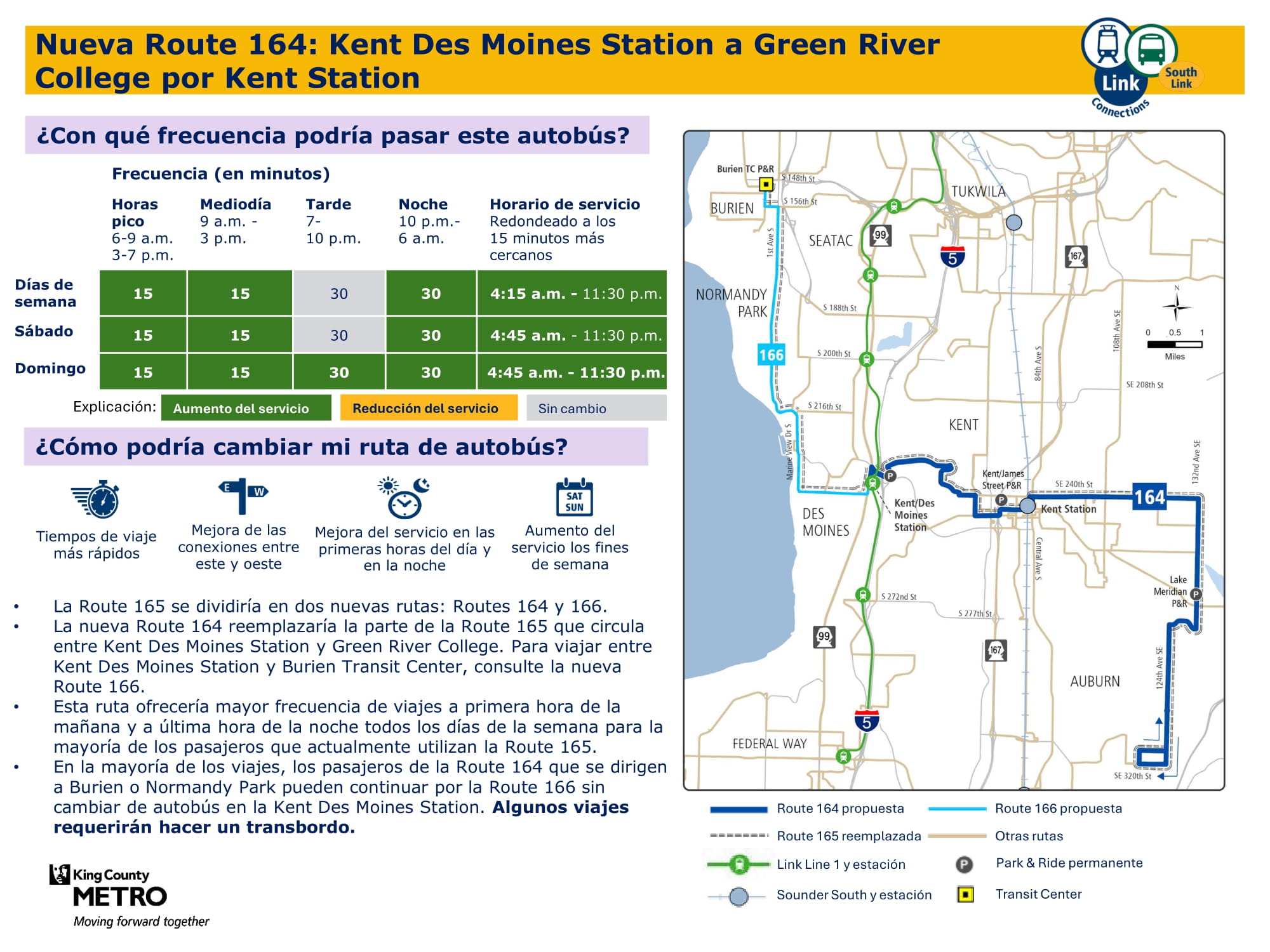 - Ampliación del servicio durante los fines de semana: Se introduce un nuevo servicio los sábados y domingos, y se incrementa la frecuencia durante los fines de semana en los corredores principales. Específicamente, habrá un nuevo servicio de fin de semana en Burien, un nuevo servicio dominical entre Kent y Federal Way y mayor frecuencia de servicio los fines de semana entre la estación Kent Des Moines, la estación Kent, Kent East Hill y Green River College. La propuesta final de la red proporcionará un 57 % más de viajes los sábados y casi el doble de viajes los domingos en comparación con el servicio actual.