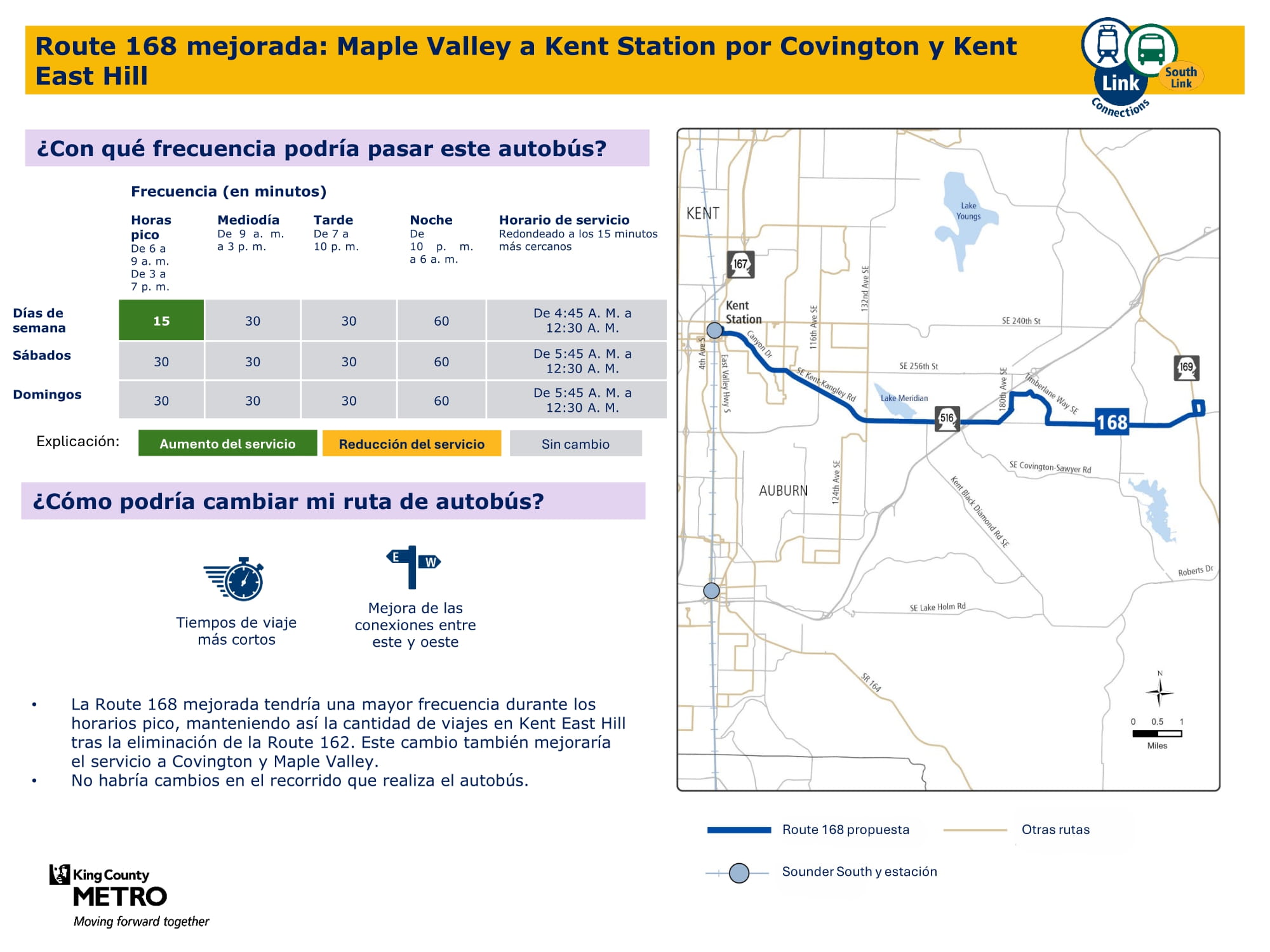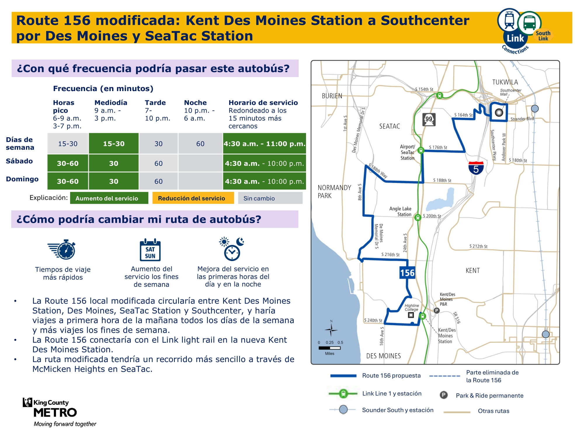 Mejor servicio con más viajes todos los días de la semana. Se conectará con el tren ligero Link en la estación Kent Des Moines y tendrá una ruta más directa a través de McMicken Heights. |