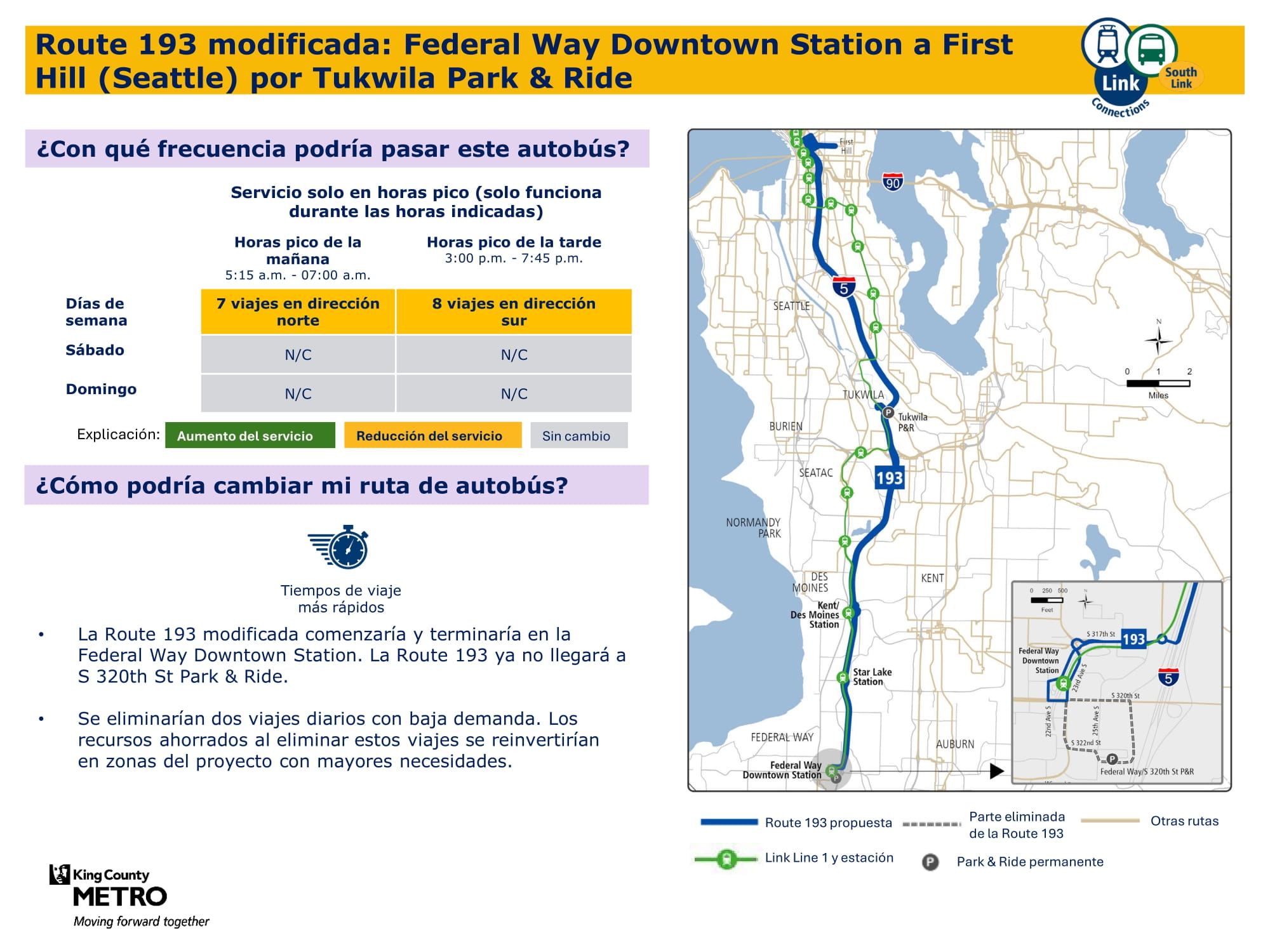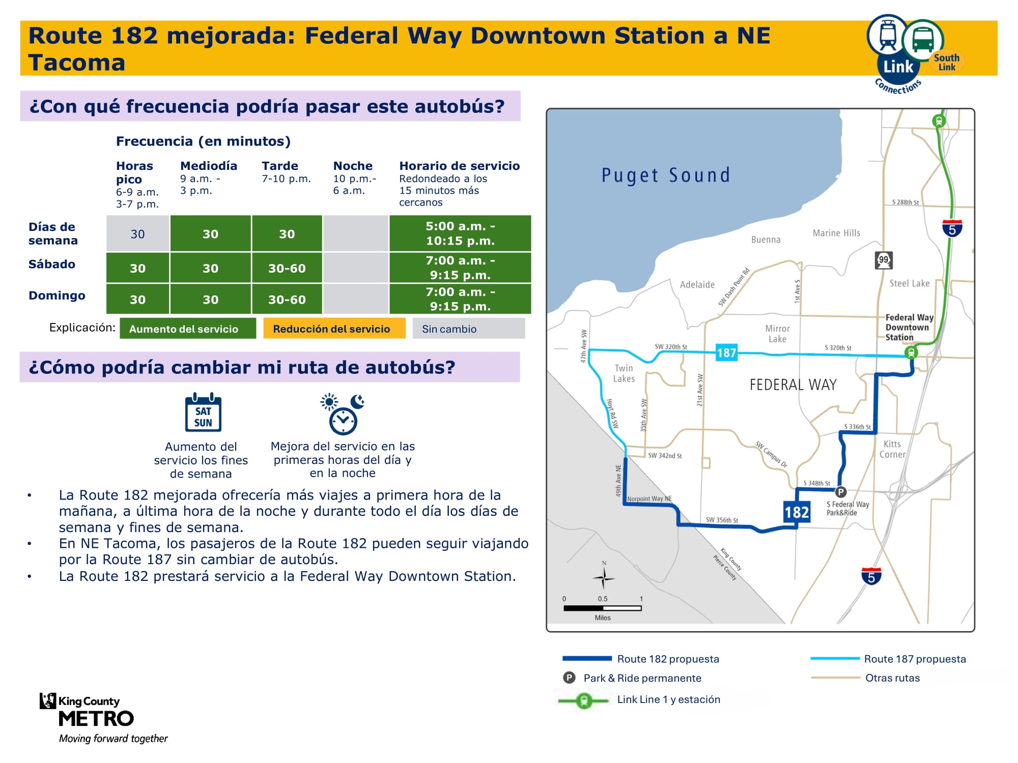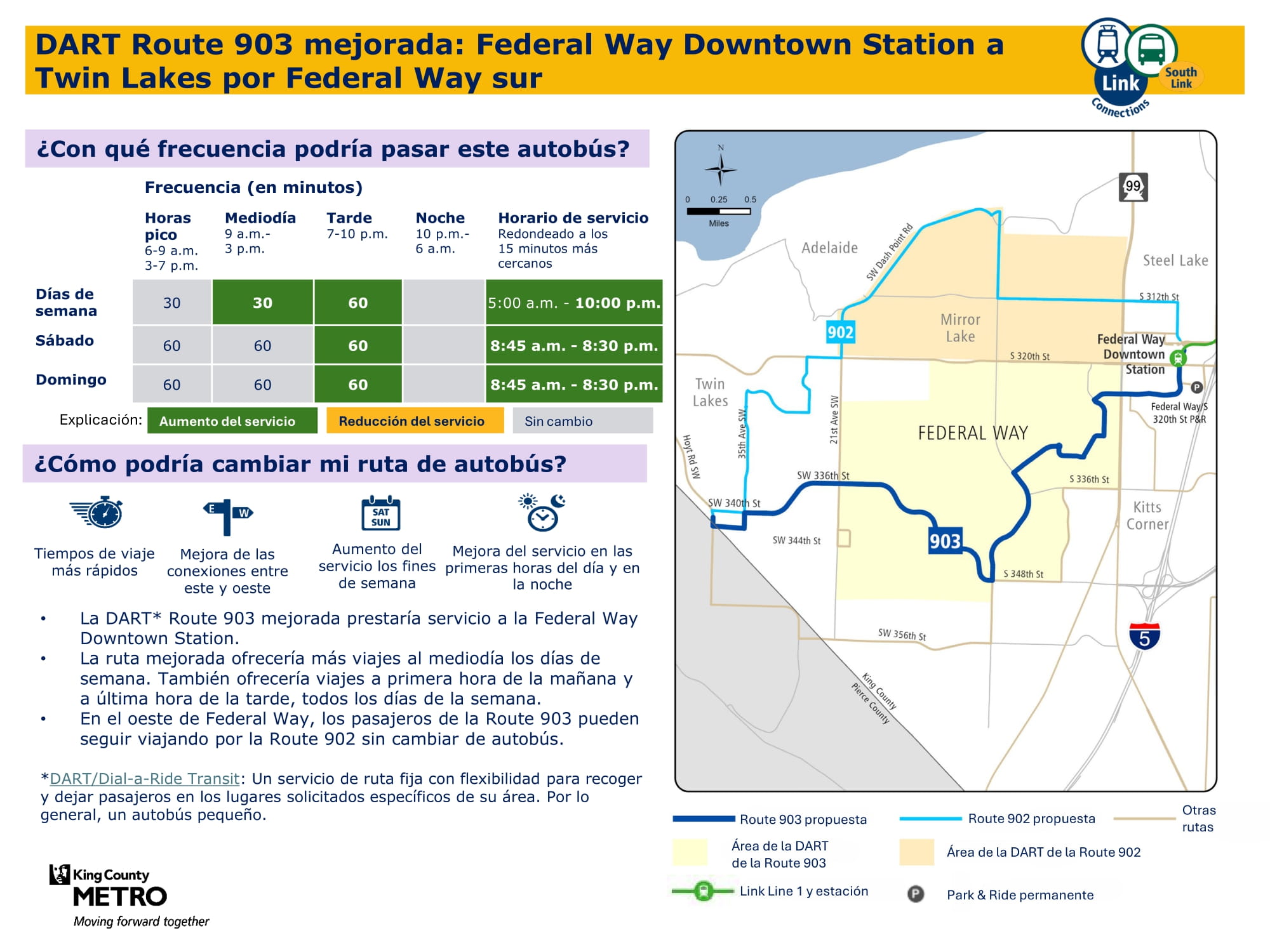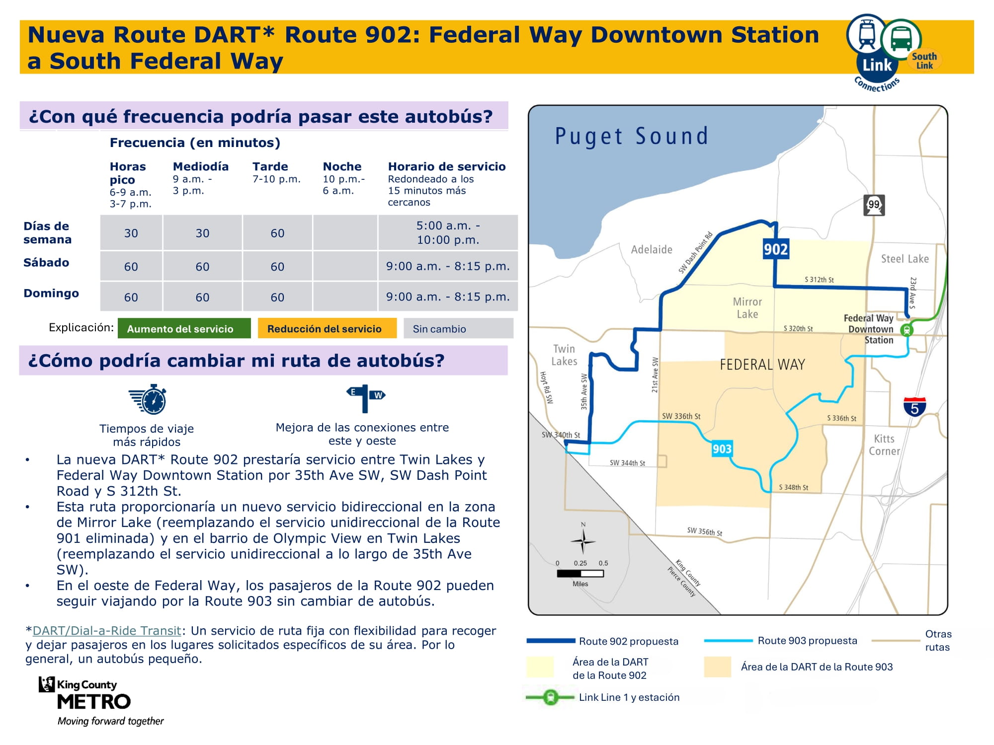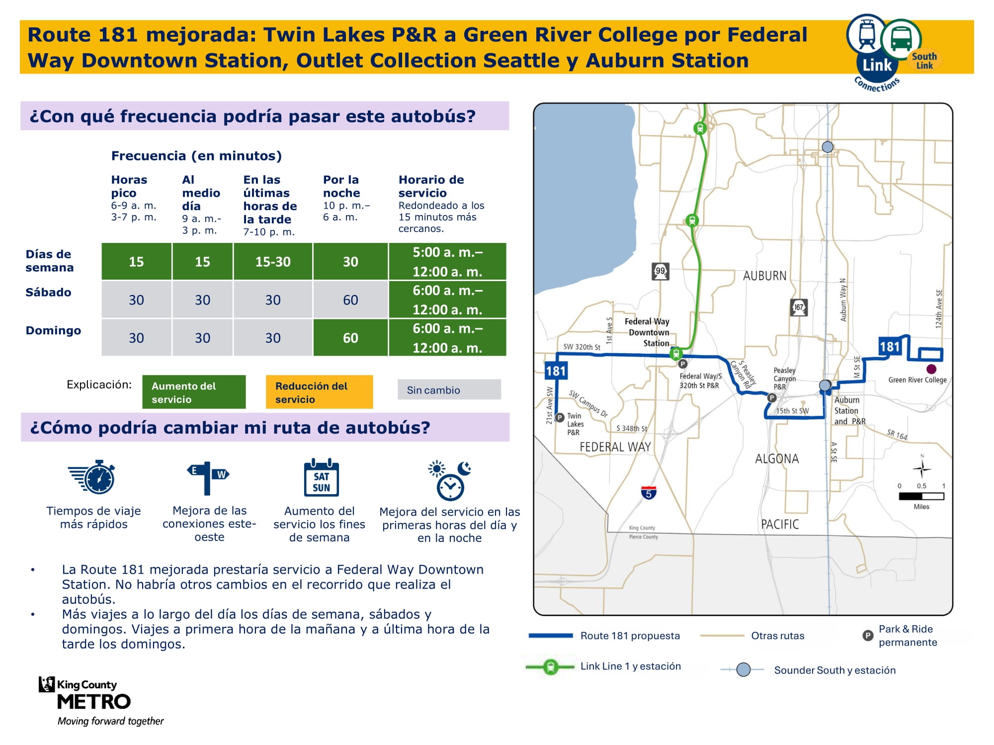 - Servicio más rápido: Actualización de rutas de autobuses entre Federal Way oeste y el centro de Federal Way para que esta conexión sea más rápida, más directa y más fácil de navegar.