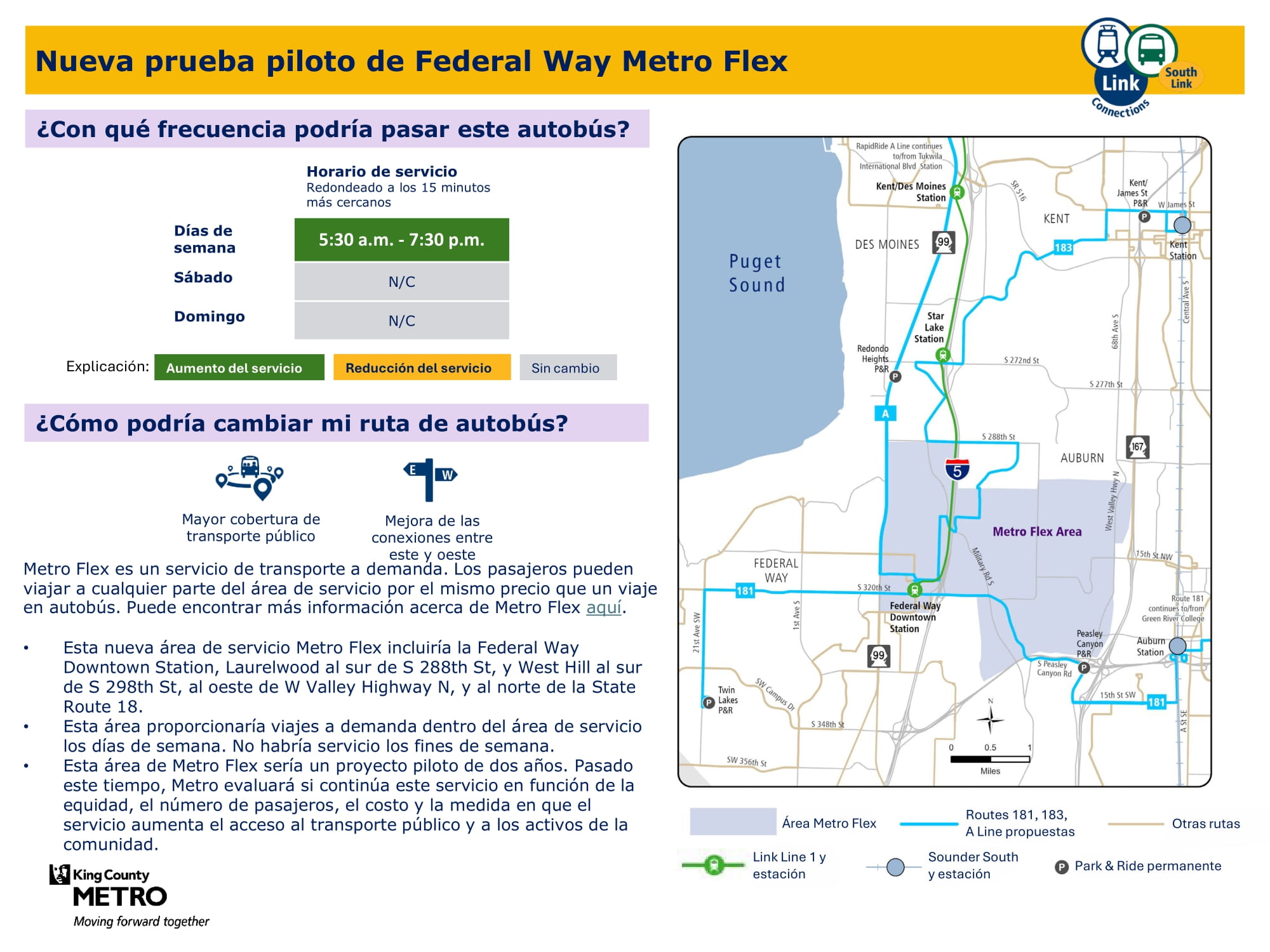 | Prueba piloto de Metro Flex en Federal Way Presta servicio a Federal Way y Auburn | Nueva zona piloto de Metro Flex que ofrece servicio a demanda de lunes a viernes. Servicio en la estación Federal Way Downtown, Laurelwood al sur de S 288th St y West Hill al sur de S 298th St, al oeste de W Valley Highway N y al norte de la Ruta estatal 18. |