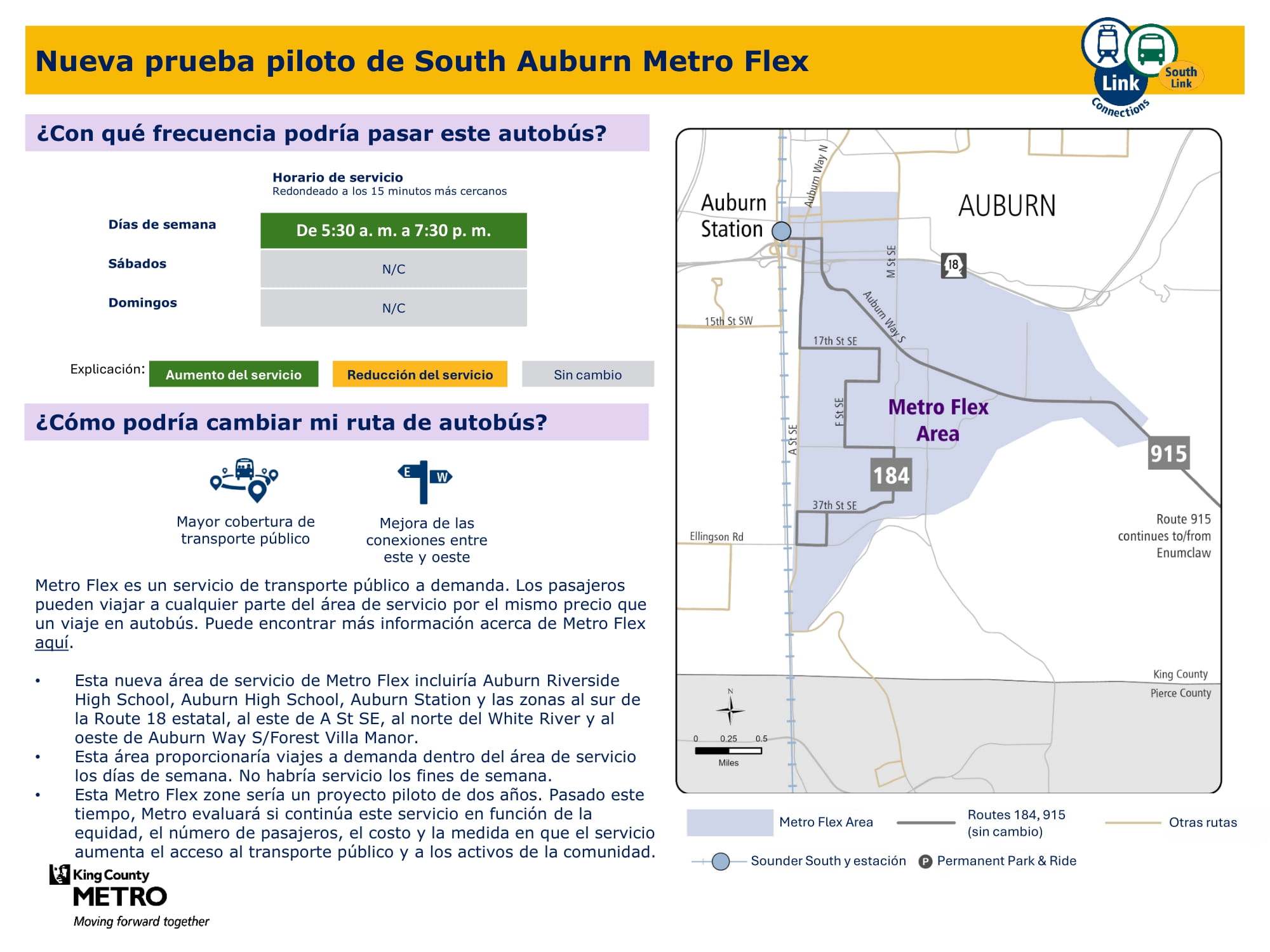 | Prueba piloto de Metro Flex en el sur de Auburn Presta servicio a Auburn | Nueva zona piloto de Metro Flex que ofrece servicio a demanda de lunes a viernes. Servicio en áreas al sur de la Ruta estatal 18, al este de A Street SE, al norte de White River y al oeste de Auburn Way S/Forest Villa Manor. Incluye la estación Auburn y la Riverside High School. |
