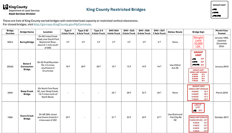 Vehicle weight restrictions for bridges in unincorporated King County