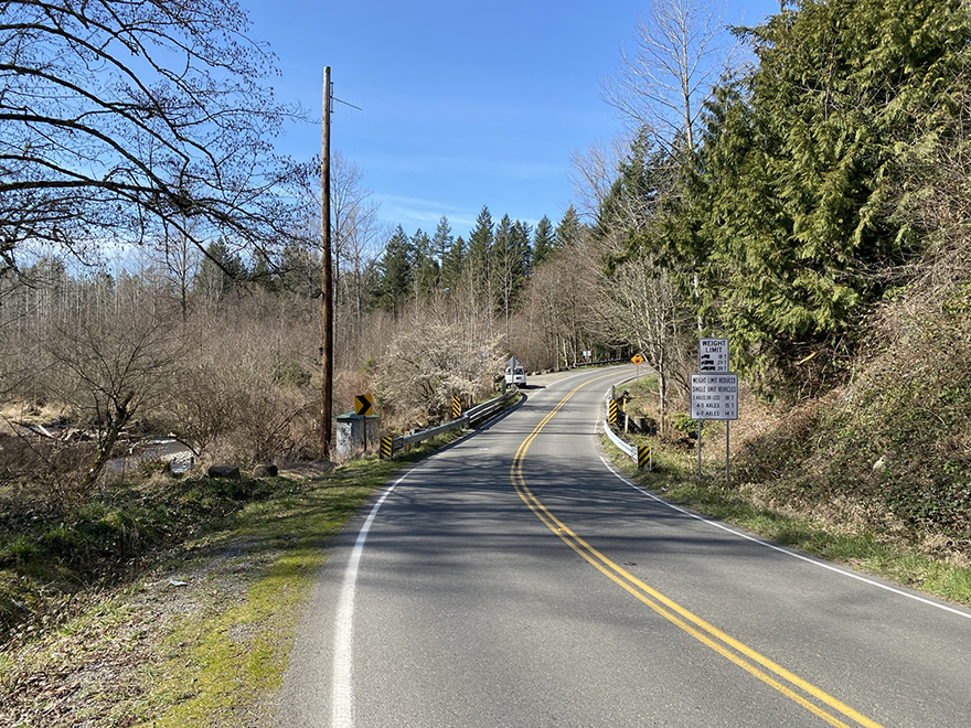 This is a photo of SE Mud Mountain Road approaching the bridge from the east. The curve in the road limits the ability to see traffic ahead, especially at night. The county will lessen the severity of this curve to improve sight distance for drivers. (Photo: March 2021)