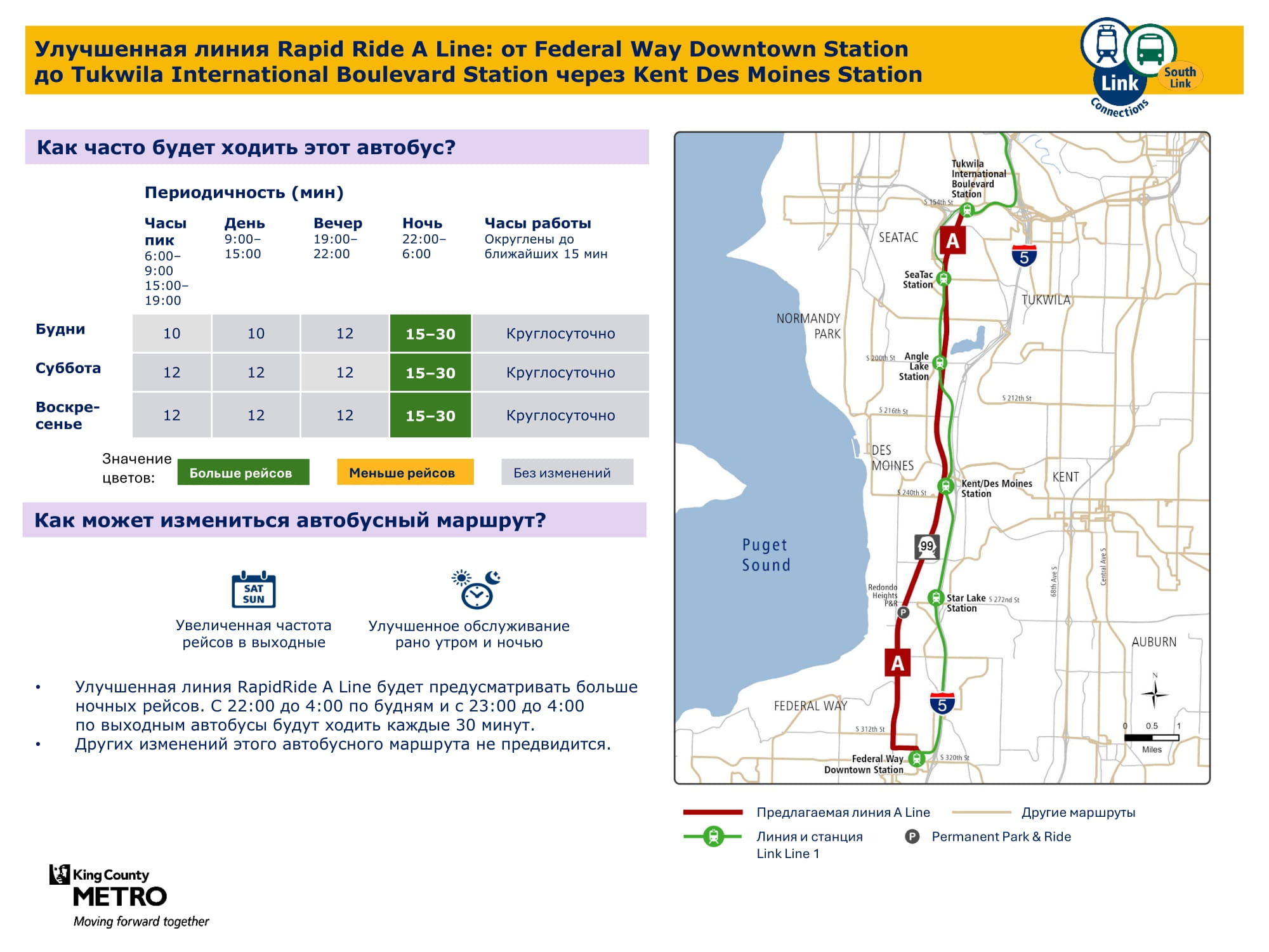 | Скоростная автобусная линия РапидРайд Эй-лайн (RapidRide A Line) Проходит через Federal Way, Des Moines, Kent, SeaTac и Tukwila |