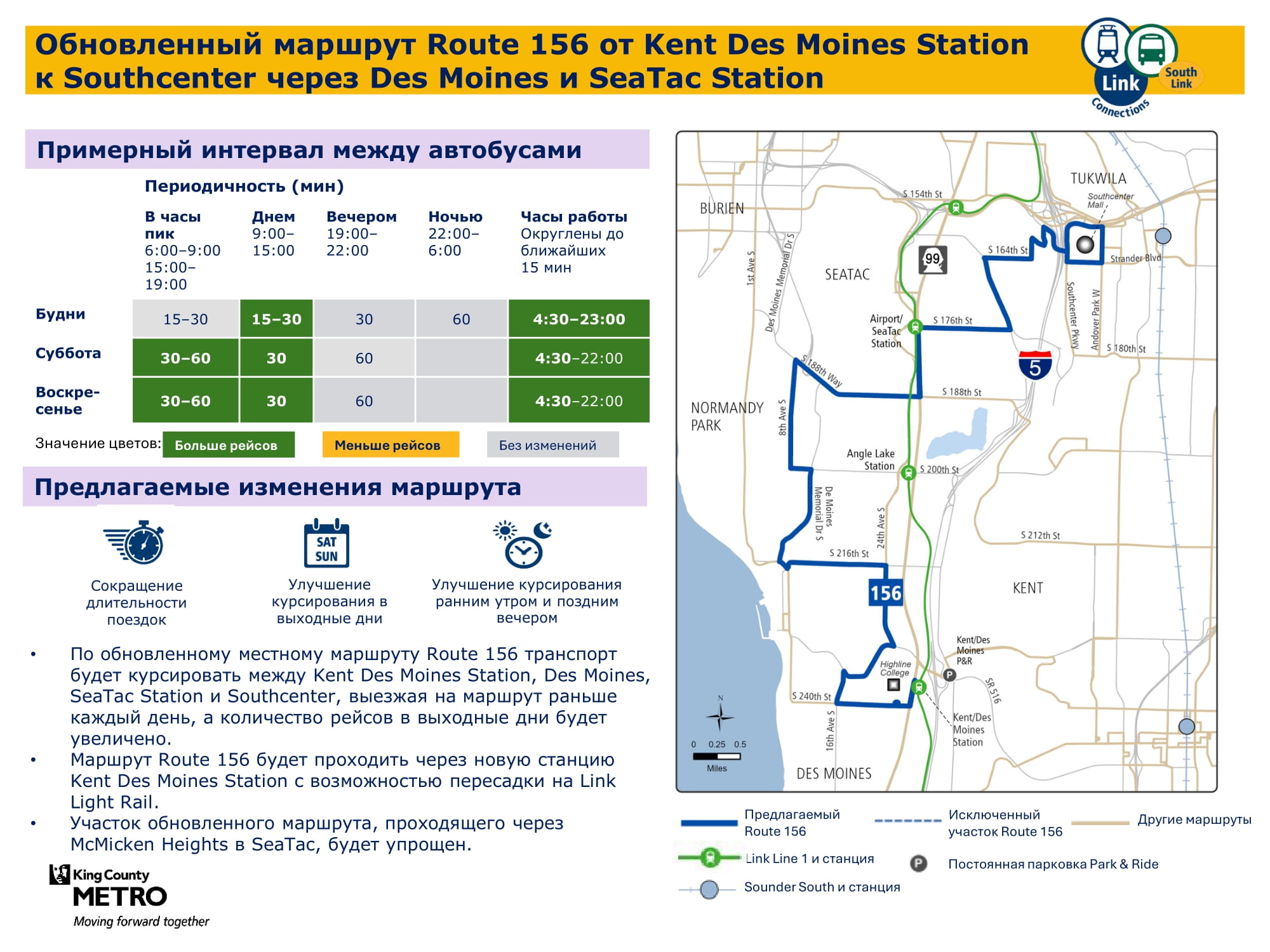 | 156 Проходит через Kent, Des Moines, SeaTac, Tukwila |