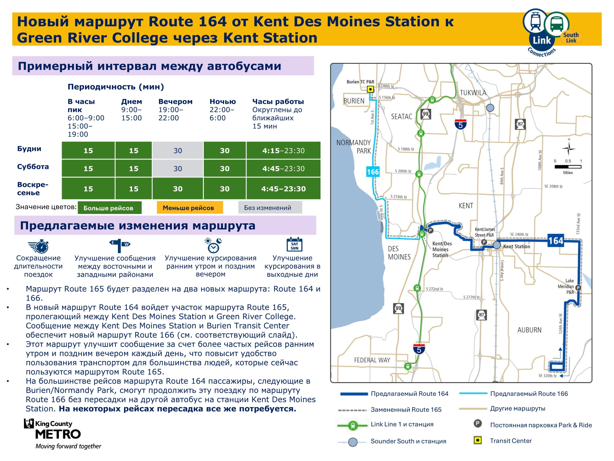 От Kent Des Moines Station к Green River College через Kent Station Новый частый маршрут с большим количеством рейсов в течение всей недели. Частичная замена маршрута 165. Будет обеспечивать пересадку на легкорельсовый трамвай Link на станции Kent Des Moines. Некоторые рейсы превратятся в рейсы по маршруту 166 для пассажиров, продолжающих поездку после станции Kent Des Moines. Узнайте, как будут работать маршруты 164 и 166 |