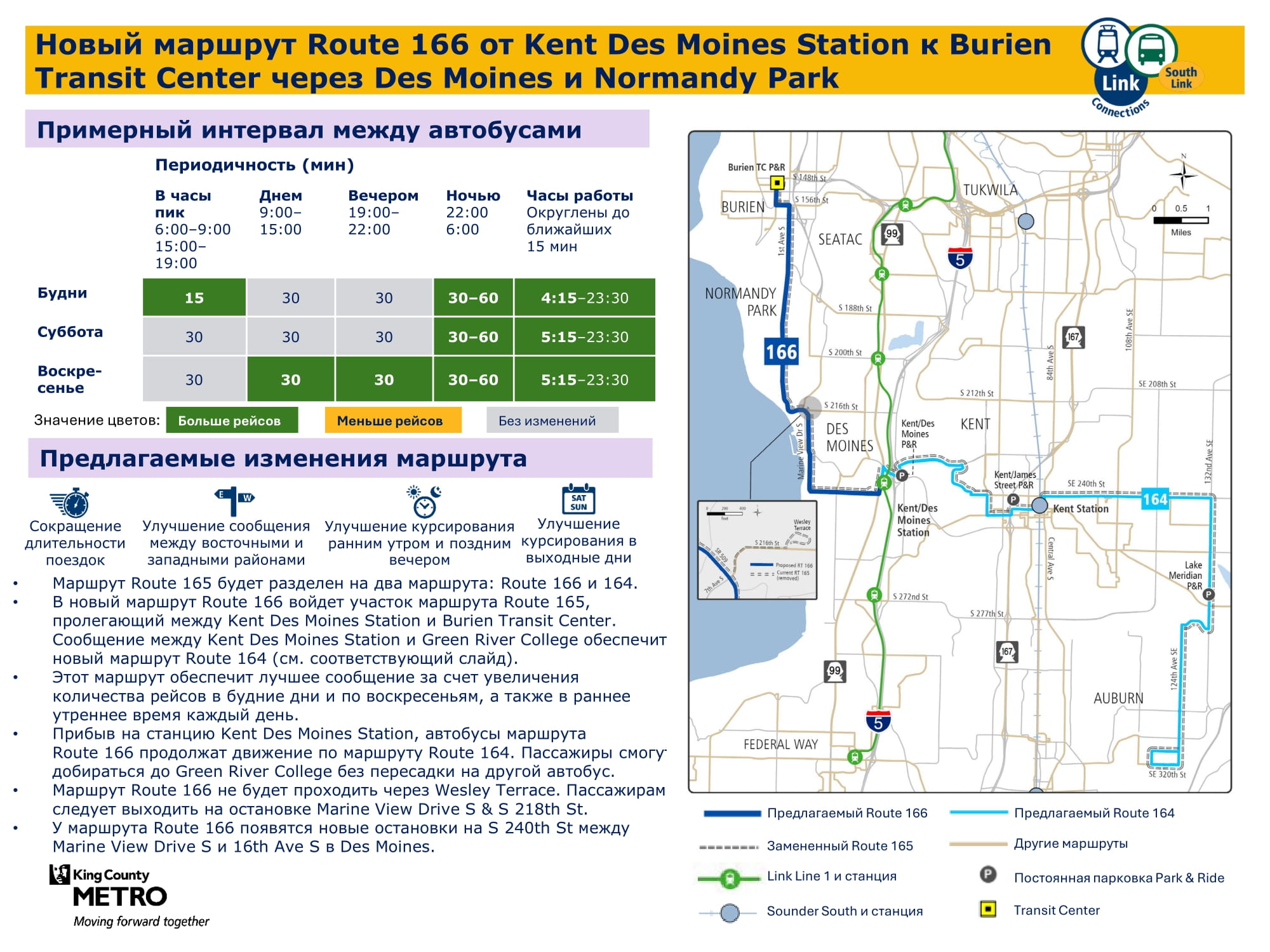Новый маршрут с повышенной частотой курсирования в часы пик и с большим количеством рейсов каждый день. Частично заменяет маршрут 165. Будет обеспечивать пересадку на легкорельсовый транспорт Link на станции Kent Des Moines. Все рейсы станут частью маршрута 164 для пассажиров, продолжающих поездку после станции Kent Des Moines. Узнайте, как будут работать маршруты 164 и 166 |