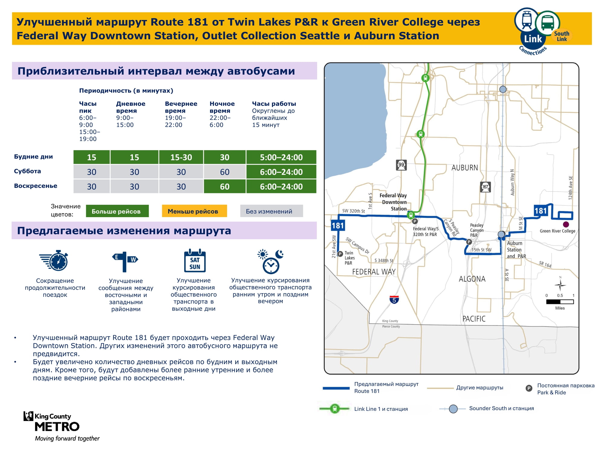 Улучшенный маршрут с сокращением интервалов движения и с большим количеством рейсов в течение всей недели. Он будет обеспечивать пересадку на легкорельсовый трамвай Link на станции Federal Way Downtown. |