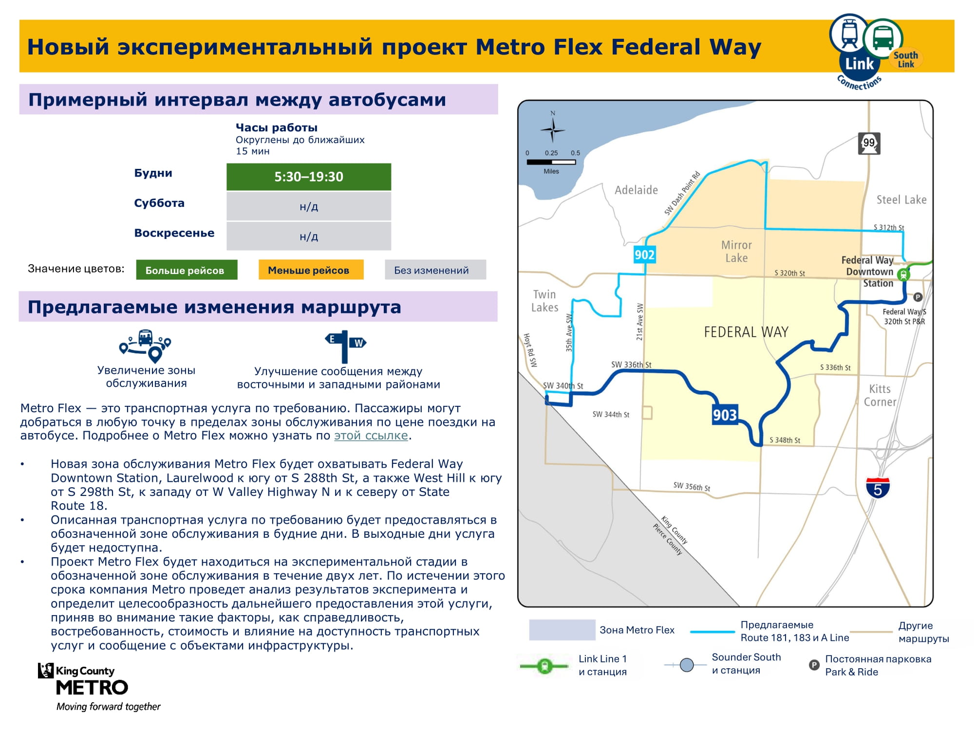 - Новые варианты услуг транспорта по запросу. Запуск услуг транспорта по запросу Metro Flex в тестовом режиме в двух новых городах — Federal Way и Auburn.