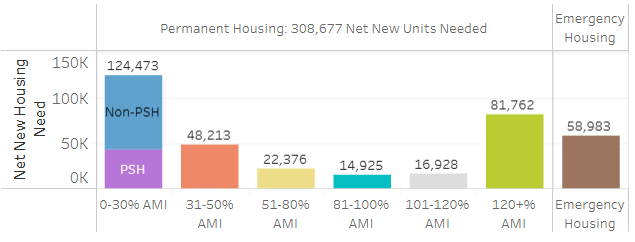 The King County Housing Needs Dashboard offers a look at final King County countywide housing need projections from the Washington State Department of Commerce for permanent housing and emergency housing needs, along with the results of the Affordable Housing Committee's recommended methods of allocating permanent and emergency housing needs to jurisdictions.