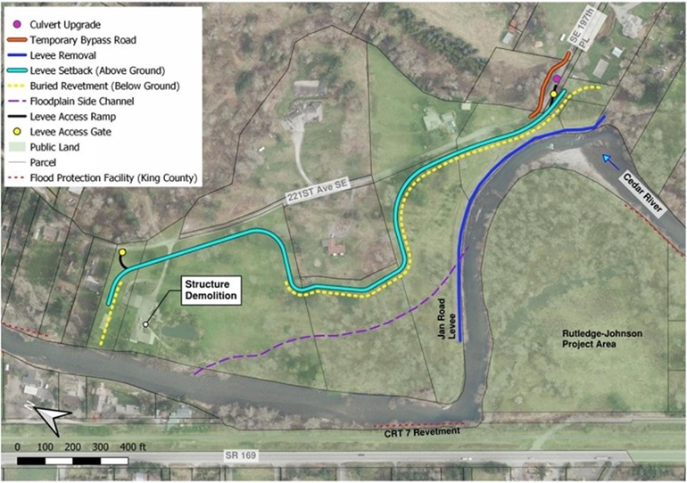 Additionally, the Jan Road Levee directed flows toward the Cedar River Trail Site 7 (CRT7) Revetment, which protects the Cedar River Trail (Trail) and State Route (SR) 169. Erosion of the CRT7 Revetment could lead to damage of the Trail and SR 169, resulting in costly repairs. The old levee also disconnected the river from its floodplain eliminating access to potential flood storage and rearing habitat necessary to raise healthy salmon.