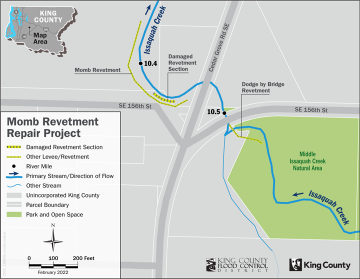 The Momb Revetment on Issaquah Creek helps reduce the risk of flood and erosion damage to Southeast 156th Street. The street provides sole access to approximately 30 homes. Flooding in February 2020 damaged the revetment creating a flood and safety risk to Southeast 156th Street, Cedar Grove Road Southeast, and public utilities. The damage includes loss of rock, exposed riverbank material, and two cottonwood trees at risk of falling into the creek.