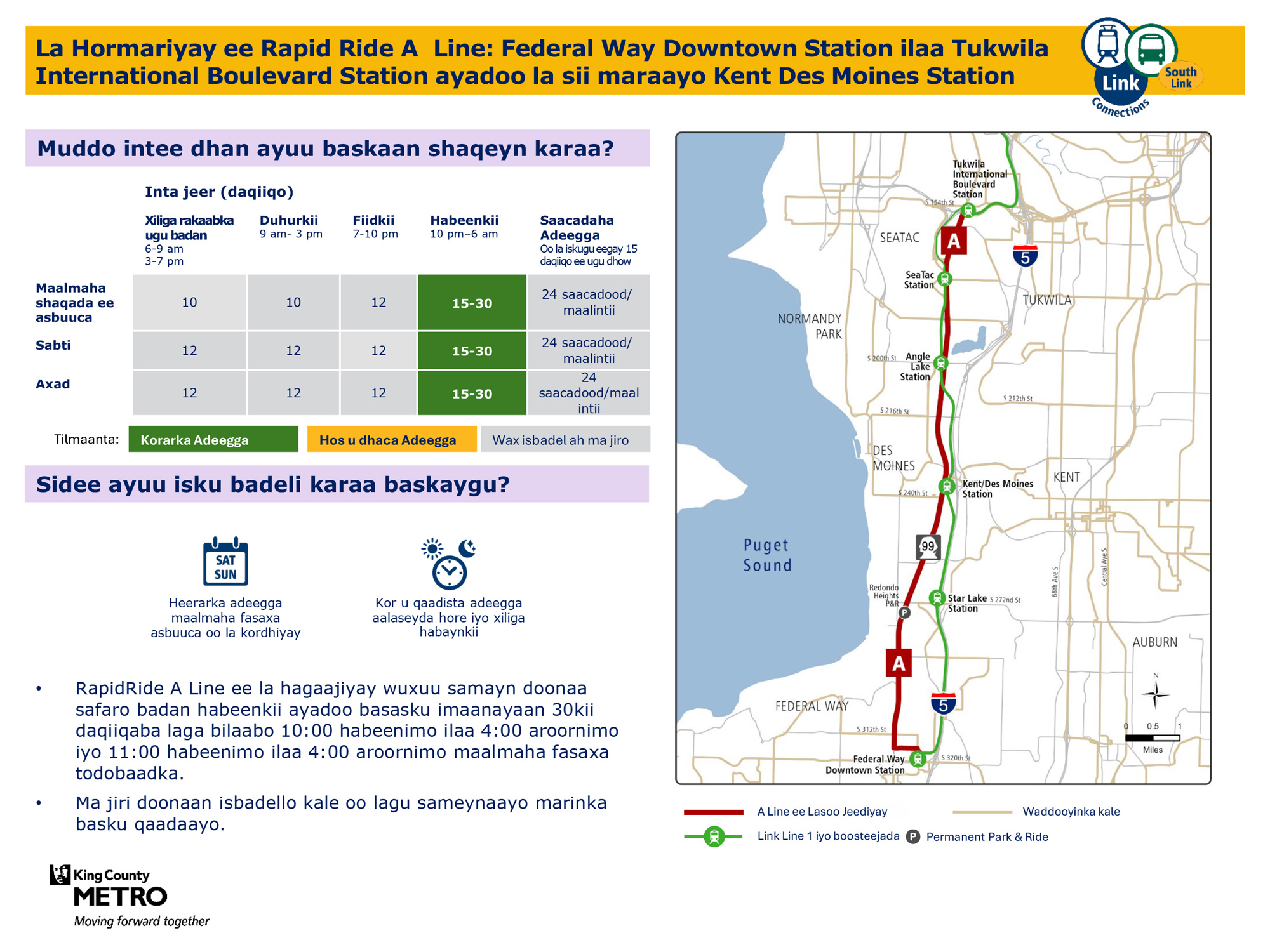 | RapidRide A Line Waxay u adeegtaa Federal Way, Des Moines, Kent, SeaTac, Tukwila |