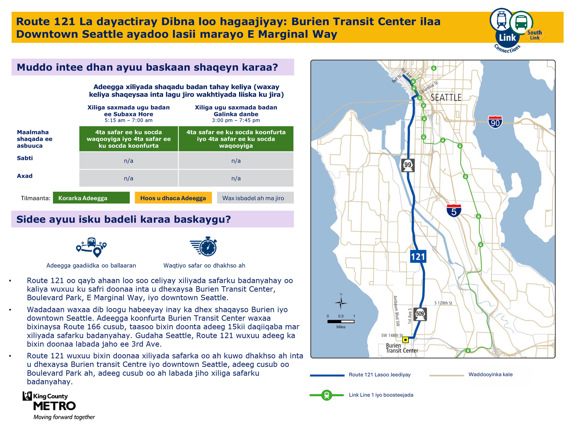 | 121 Waxay u adeegtaa Burien, magaalada hoose Seattle |