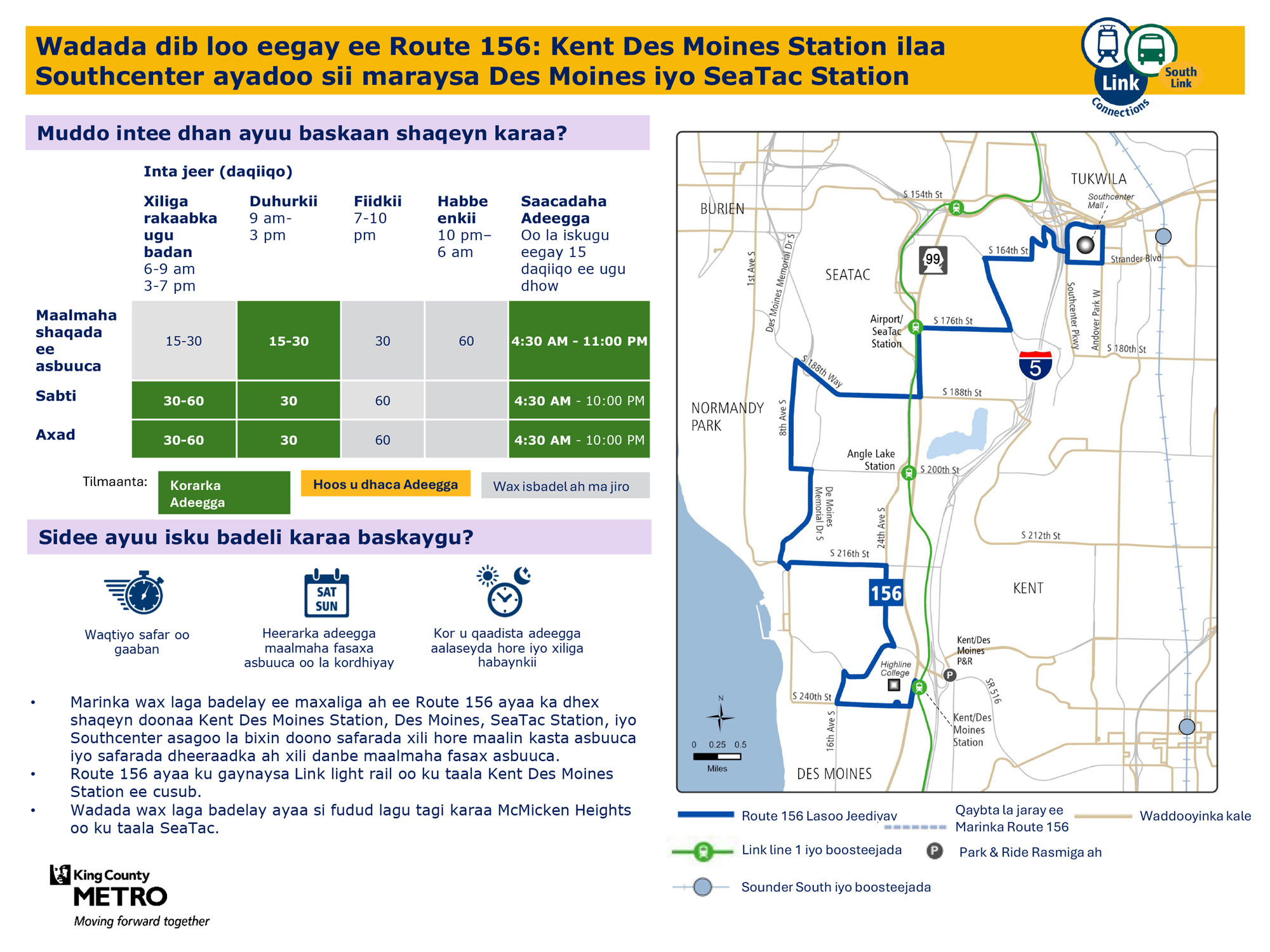 | 156 Waxay u adeegtaa Kent, Des Moines, SeaTac, Tukwila |