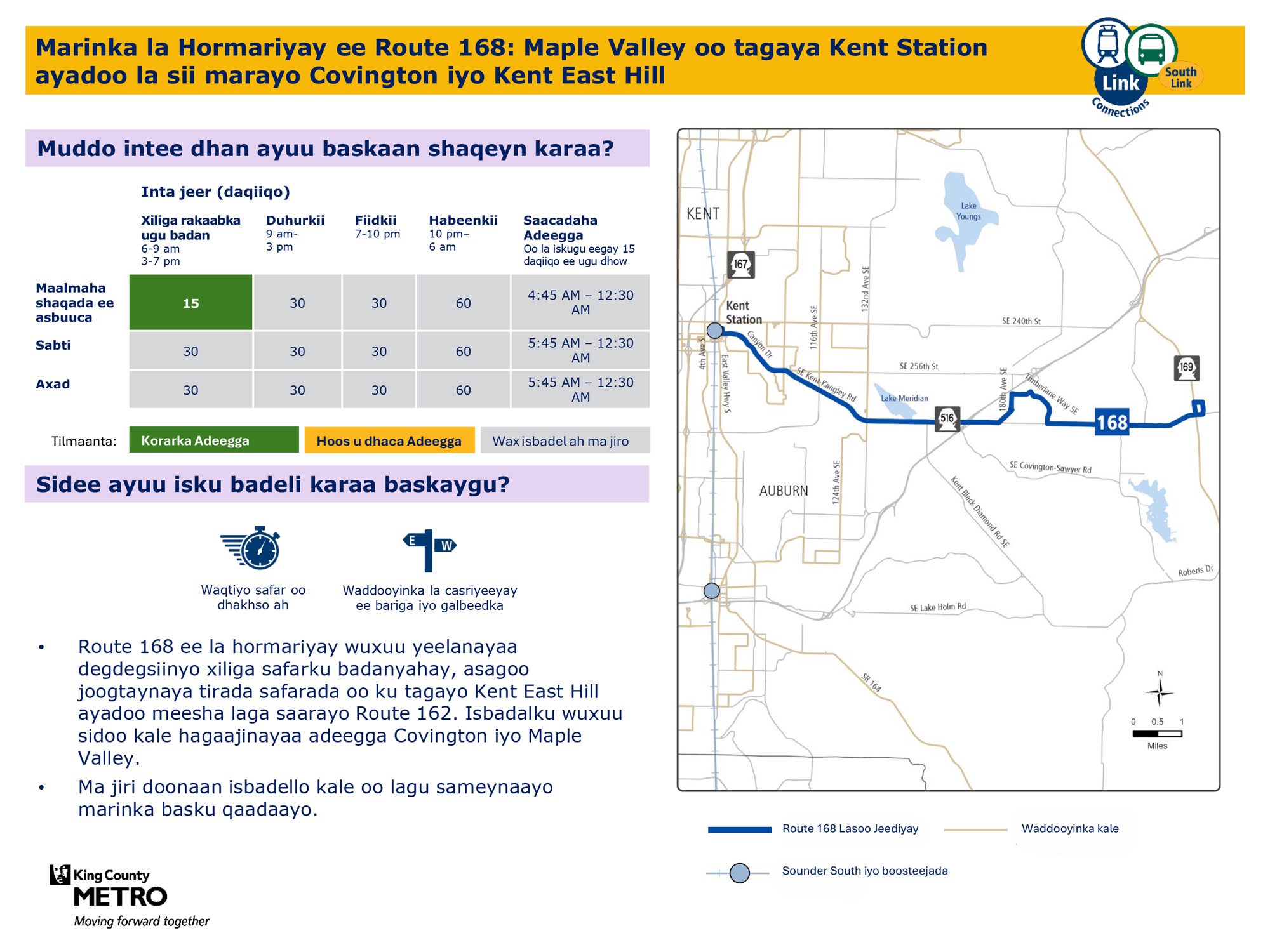 Wado cusub oo joogto ah oo leh safaro badan maalin kasta todobaadka. Waxay badalaysaa qayb kamid ah Wadada 165. Waxay kaga xirtaa tareenka fudud ee Link barta Kent Des Moines Station. Safarada qaar waxay noqonayaan Wadada 166 safarada rakaabka u socdaalaya goobo ka baxsan Kent Des Moines Station. Eeg sida ay u shaqeyn doonaan waddooyinka 164 iyo 166 |